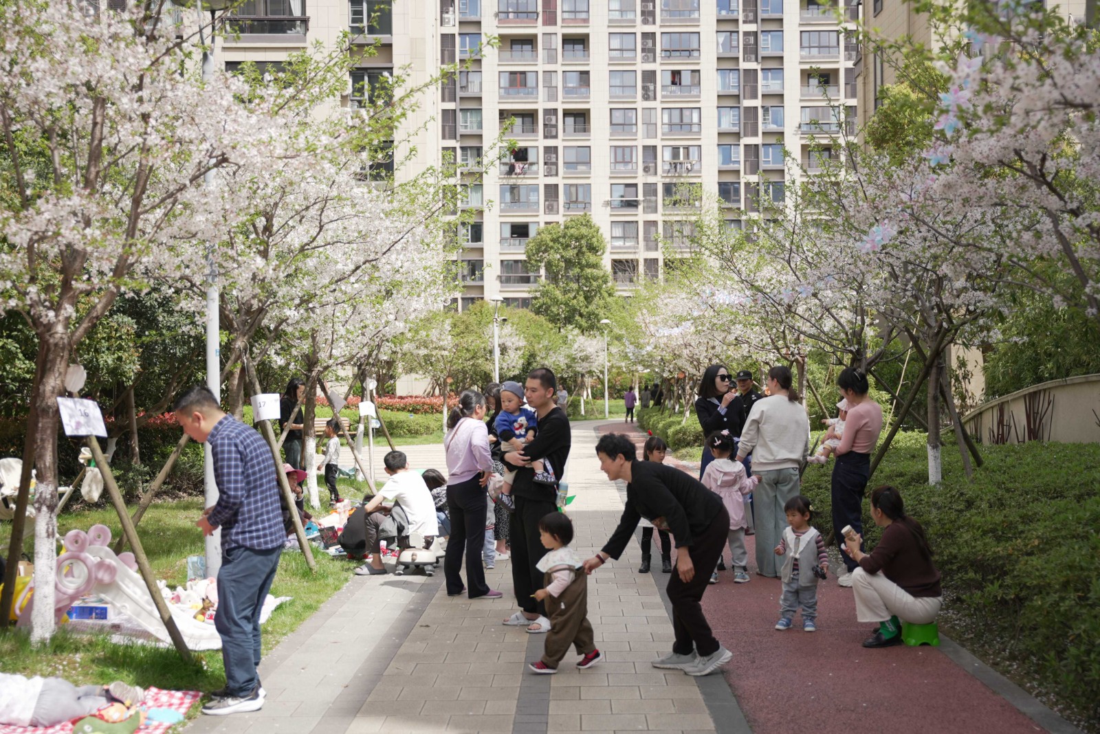 在未来盛园小区,进大门左拐,就能看到一条百米长的樱花大道,道路两旁的樱花树开得很盛,这片区域顺理成章成了小区最热闹的地方。