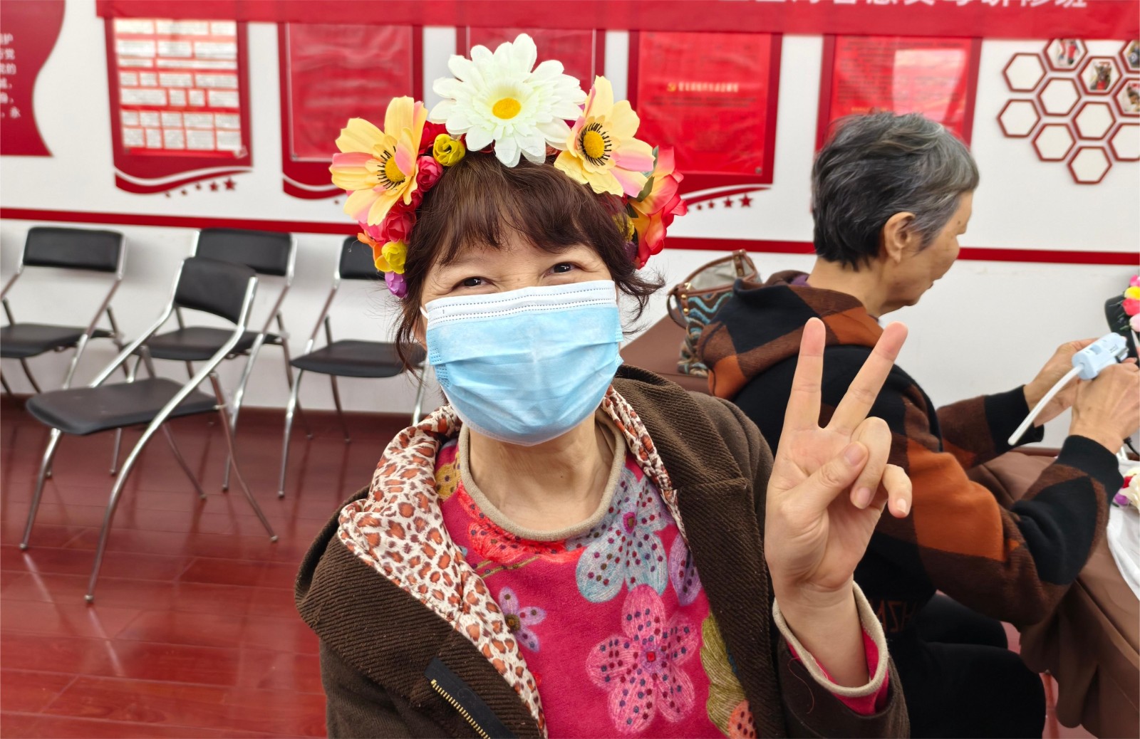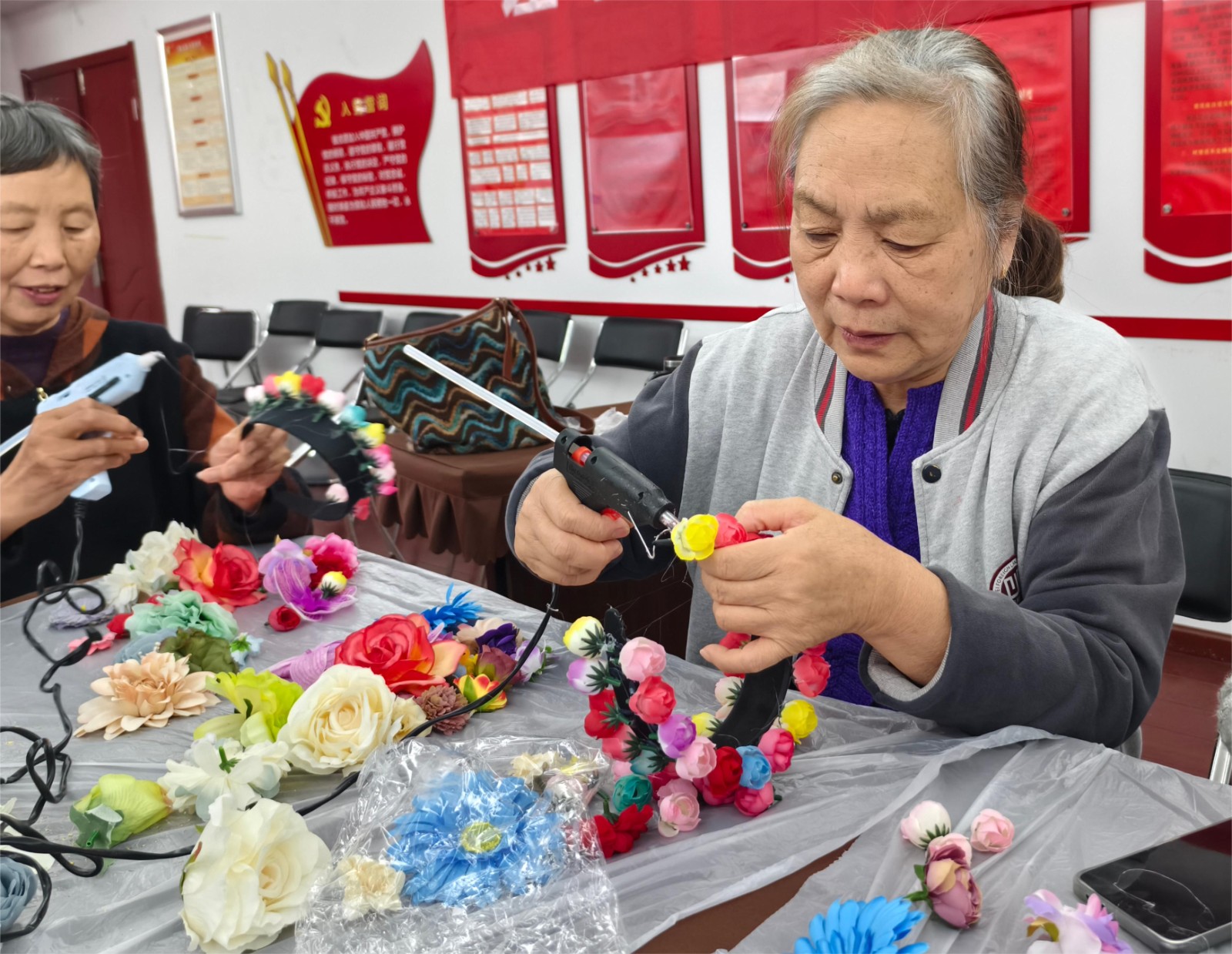居民在老师的指导下按照材料的不同,合理使用每一种工具,精心搭配花朵,这些零碎的材料在大家的手中被巧妙地缠绕与融合,组合成了款式精致、美观大方的簪花。大家边制作边聊着幸福美好日子里的点点滴滴,现场气氛其乐融融。