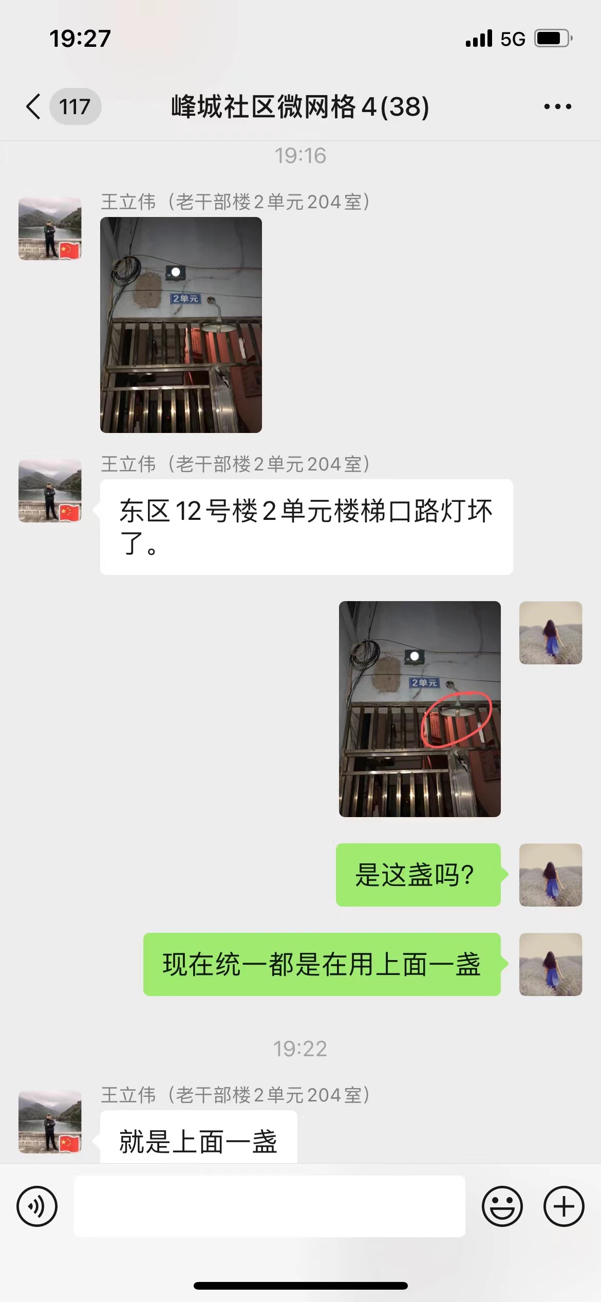 4月8晚7:00多,正在辖区走访的峰城社区网格员小周收到了微网格4群居民反映的路灯故障问题,她迅速在群里进行了回应,并立即赶到现场进行核实,并反馈到了社区工作群。