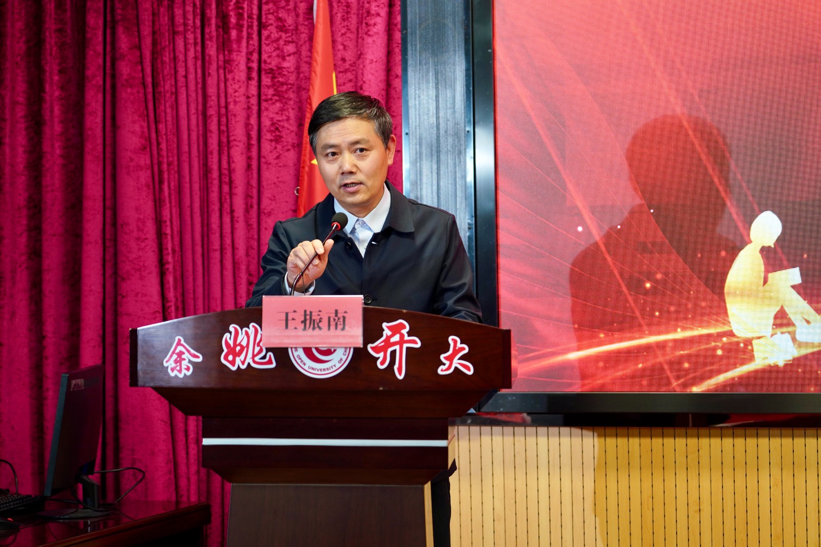 学院党总支副书记、副院长王振南代表学院向全体新生表示最热烈的欢迎,也向获得国家开放大学奖学金的优秀学员表示最诚挚的祝贺。他以2024年余姚市政府工作报告提出“更强力度推进共富先行,不断创造‘最名邑’美好生活”为切入点,向新学员简要介绍了国家开放大学发展历程、办学体系及功能;余姚学院的办学性质、格局及历年成果。他希望全体新学员在今后的学习中:1.树立终身学习意识,主动学习;2.树立时间管理意识,坚持学习;3.树立学以致用意识,自信学习。他鼓励学员通过学习遇见更美好的自己;通过奋斗创造更美好的生活。