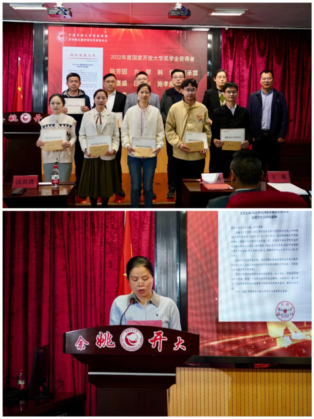 月,花开缤纷是充满欢乐的季节;月,希冀满怀充满活力的季节;月,新奇不断求知探索的季节!4月14 日上午,宁波开放大学余姚学院举行2024季开放教育开学典礼暨优秀学员表彰仪式活动分现场和线上直播同步进行。学院党总支书记、院长沃其洪,副书记、副院长王振南出席,教学线相关处室主任新班班主任、优秀校友代表、22年度国放大学奖学金获得者新学员代表共计127人参加现场活动,另有317位新学员在云课堂平台上收看直播。活动由副院长闻建科主持。