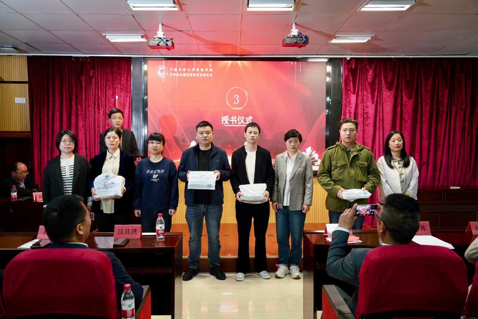 为增添开大学习之旅的神圣感、幸福感、获得感,开学典礼特设授书仪式,由新班班主任代表上台为本班学员代表递上新学期课本和学习用品。