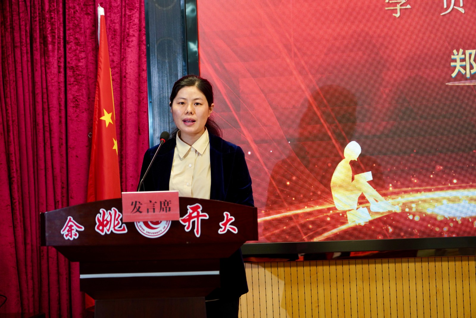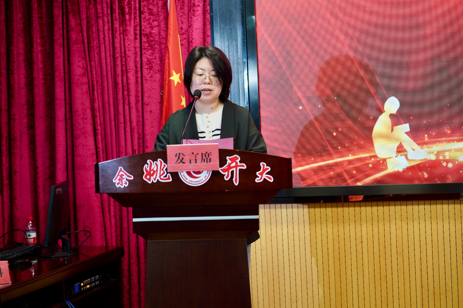 接过新书的郑丽丽作为本校新老学员双重身份上台发言,分享自己将开大五年专本科所获知识致力于工作、生活实操的成果:曾先后荣获余姚市 “优秀职工”、余姚市第七届金锤奖“杰出职工”、宁波市“首席质量官”、宁波开放大学“学习之星”、“优秀毕业生”等荣誉。对于未来第二本科的学习,她表示将继续做好以下三点:1.合理处理工学矛盾,2.日常坚持自主学习,3.及时完成学习任务。