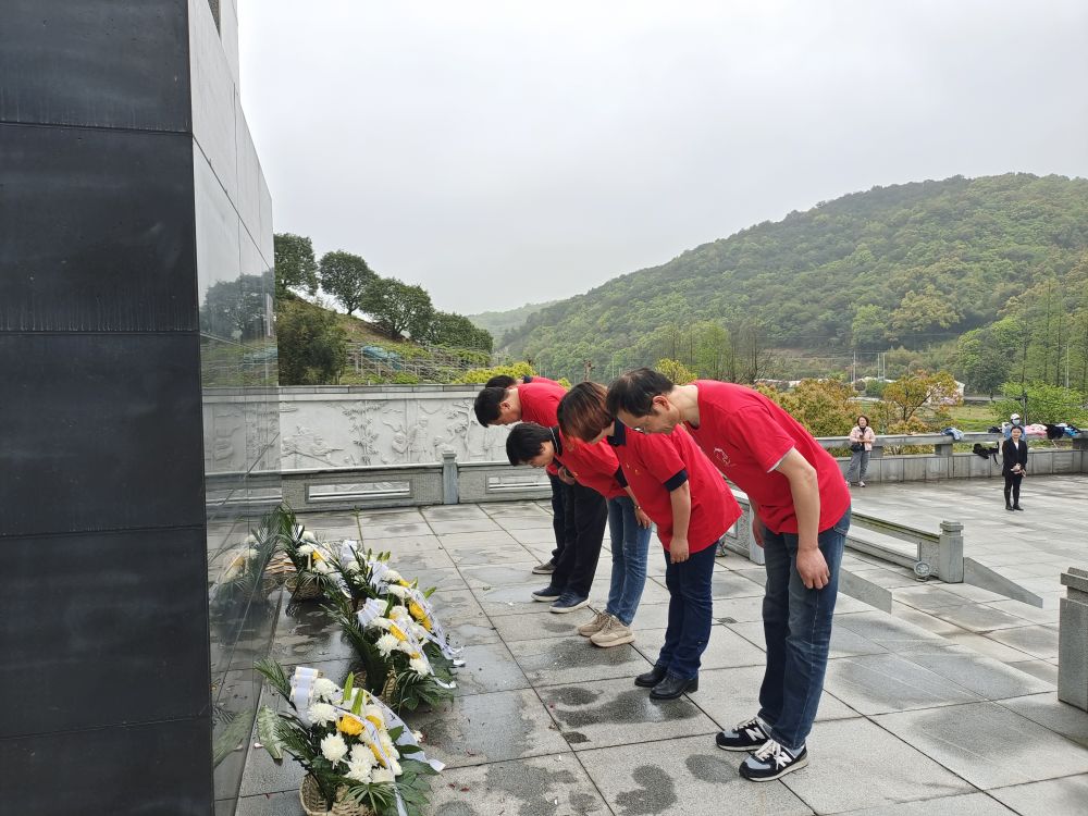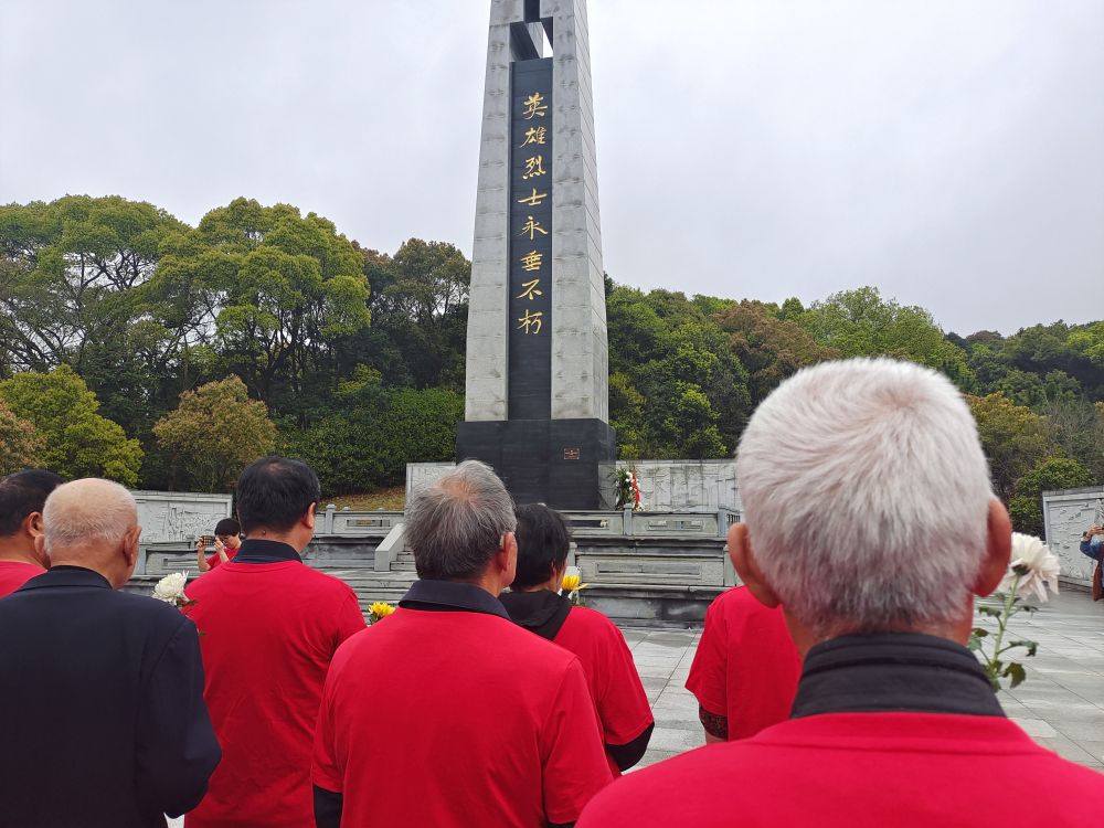 青山肃穆,铭记忠魂。党员们着红装、扬党旗,怀着无比崇高的敬意来到鄞州区英雄烈士纪念馆。大家顺着层层石阶拾级而上,烈士纪念碑巍然矗立于眼前,庄严肃穆的氛围扑面而来,“英雄烈士永垂不朽”8个金色大字在阳光下熠熠生辉。在庄严的革命烈士纪念碑前全体党员肃穆静立,齐唱中华人民共和国国歌,并向革命烈士默哀三分钟。之后,五个村社的书记及党员们向革命烈士纪念碑敬献花篮和鲜花,表达无限敬仰与无尽哀思。