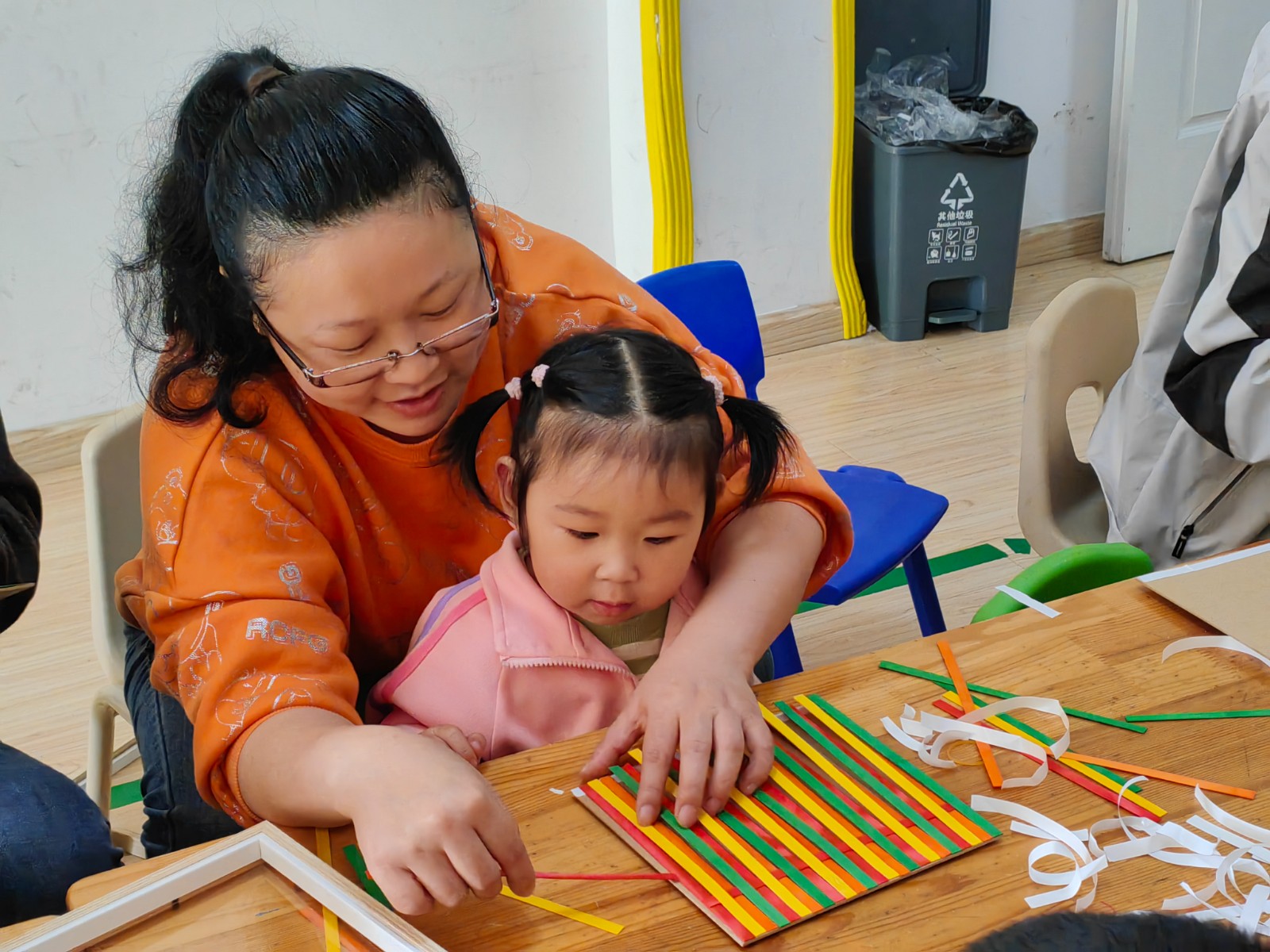本次活动在青墩社区益家“青”阅读室拉开帷幕。现场的亲子家庭通过阅读绘本的方式,吟诵出一首首描绘节气的诗句,了解关于二十四节气的相关知识。“谷雨前后人紧张,养蚕采茶都繁忙”“清明断雪,谷雨断霜”……优美的词句伴着孩子们稚气的声调,通过阅读《谷雨》,孩子们对这个节气也越来越了解。接着,青墩社区巧手社工张琦以诗意般的语言,娓娓讲述竹编技艺的千年传承与独特魅力,随后,给大家分发乐制作材料,并现场指导大家制作“谷雨竹编画”。从挑选竹条、编织框架到装饰粘贴,每一个步骤都充满了诗意与匠心,每一个细节都彰显出非遗文化的深厚底蕴。活动过程中,大家欢声笑语,每个家庭齐心协力,发挥自己的动手能力,创作属于自己的作品。