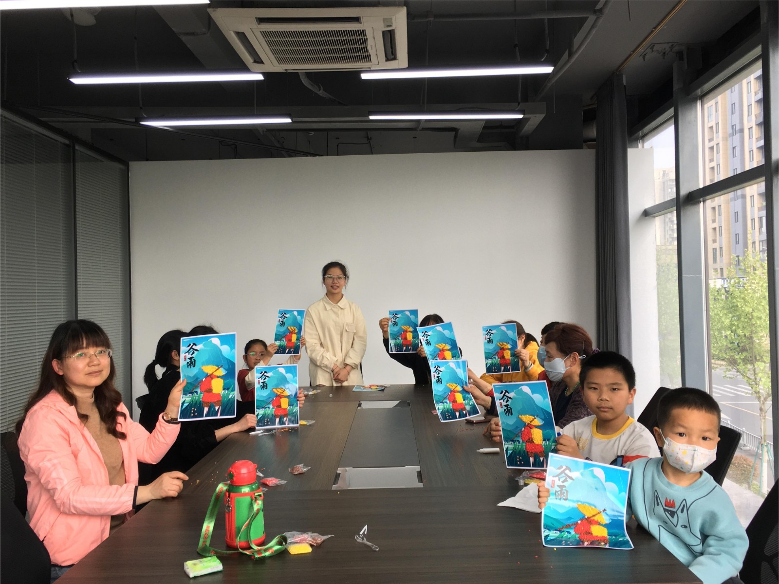 活动当天,志愿者老师给大家分发了每人一幅“谷雨”主题画:一个农民伯伯戴着斗笠,扛着锄头走在田间,天下着濛濛细雨,期待着好收成。另外,还有红色、棕色和黄色的米粒、豆子,液体胶水等材料。接着,老师一边给大家介绍谷雨的习俗,一边指导大家如何将这些米粒粘贴在画中农民伯伯的帽子上、衣服上、锄头上.......