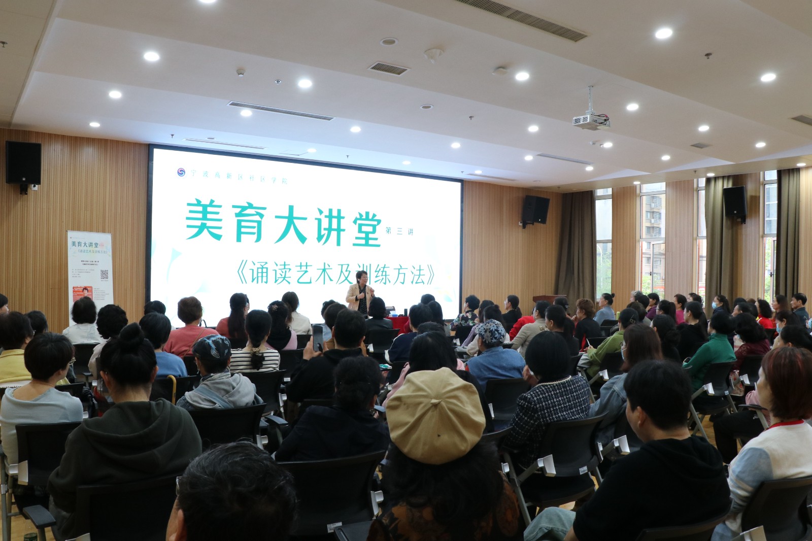417日上午,美育大讲堂第三讲《诵读艺术及训练方法》在高新区社区学院如期举行。本期的特邀嘉宾刘群是全国语言文字工作先进个人、宁波市教育局艺术委员会专家库成员、宁波市朗读联合会特聘专家、国家级普通话水平测试员,更是一位深耕语言文字教育多年的资深教授。刘教授在提升语言表达能力方面有着非凡的见解和实践经验,她为现场的100多名朗诵爱好者带来了一场精彩纷呈的朗诵艺术讲座。