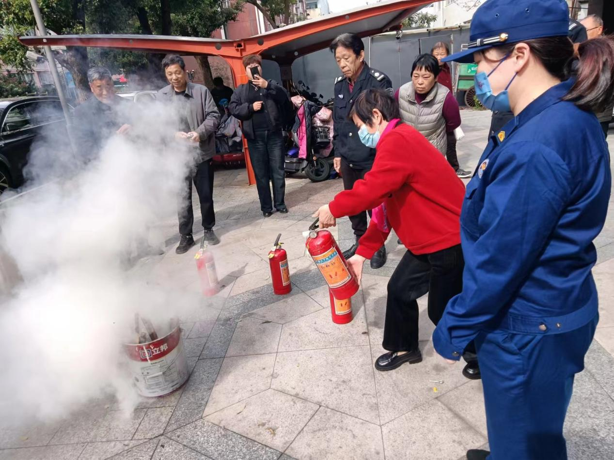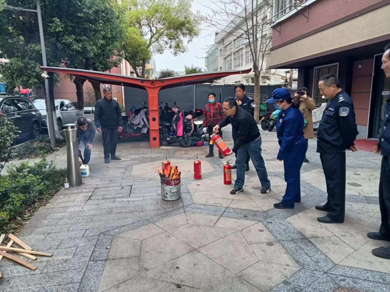 宣讲员讲解了灭火器种类、使用方法,演示了如何使用干粉灭火器,并对物业工作人员、门店经营人员、社区网格员进行了灭火器使用实操培训。