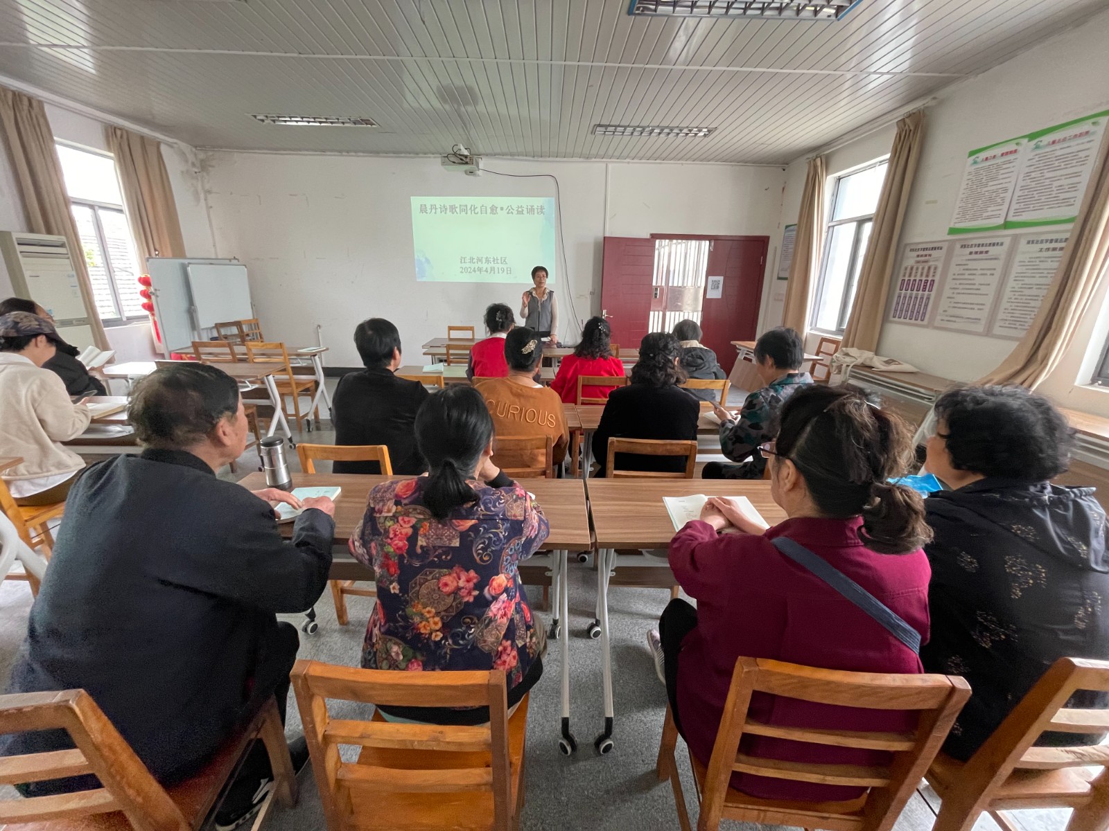 春风拂面四月天,恰是最美读书时。在4月23日“世界读书日”来临之际,河东社区新时代文明实践站意在培育阅读风尚,于19日上午开展” 最美四月天 悦读正当时“世界读书日公益诵读分享会主题活动。由宁波大学心理公益团队志愿者开展晨丹诗歌朗读自愈公益讲座,在喧嚣城市中开辟一方清净之地,朗朗读书声忆往昔学生时代,治愈心灵,传递阅读让生活更美好,读好书,好读书的理念。