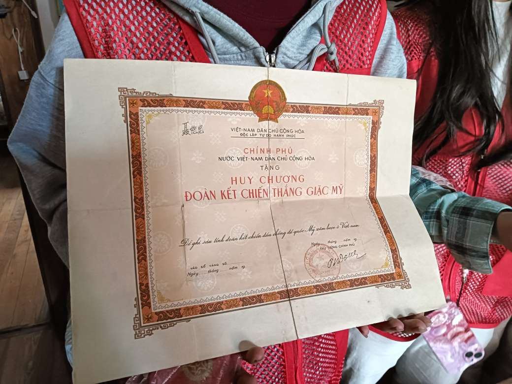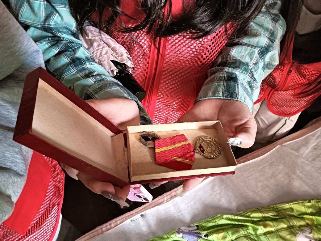 活动的最后,聂恕忠拿出珍藏已久的越战纪念勋章与越南政府颁发的荣誉奖状,青年志愿者小心翼翼的观摩欣赏,并向聂恕忠老人送上小小礼物与真挚的祝福。