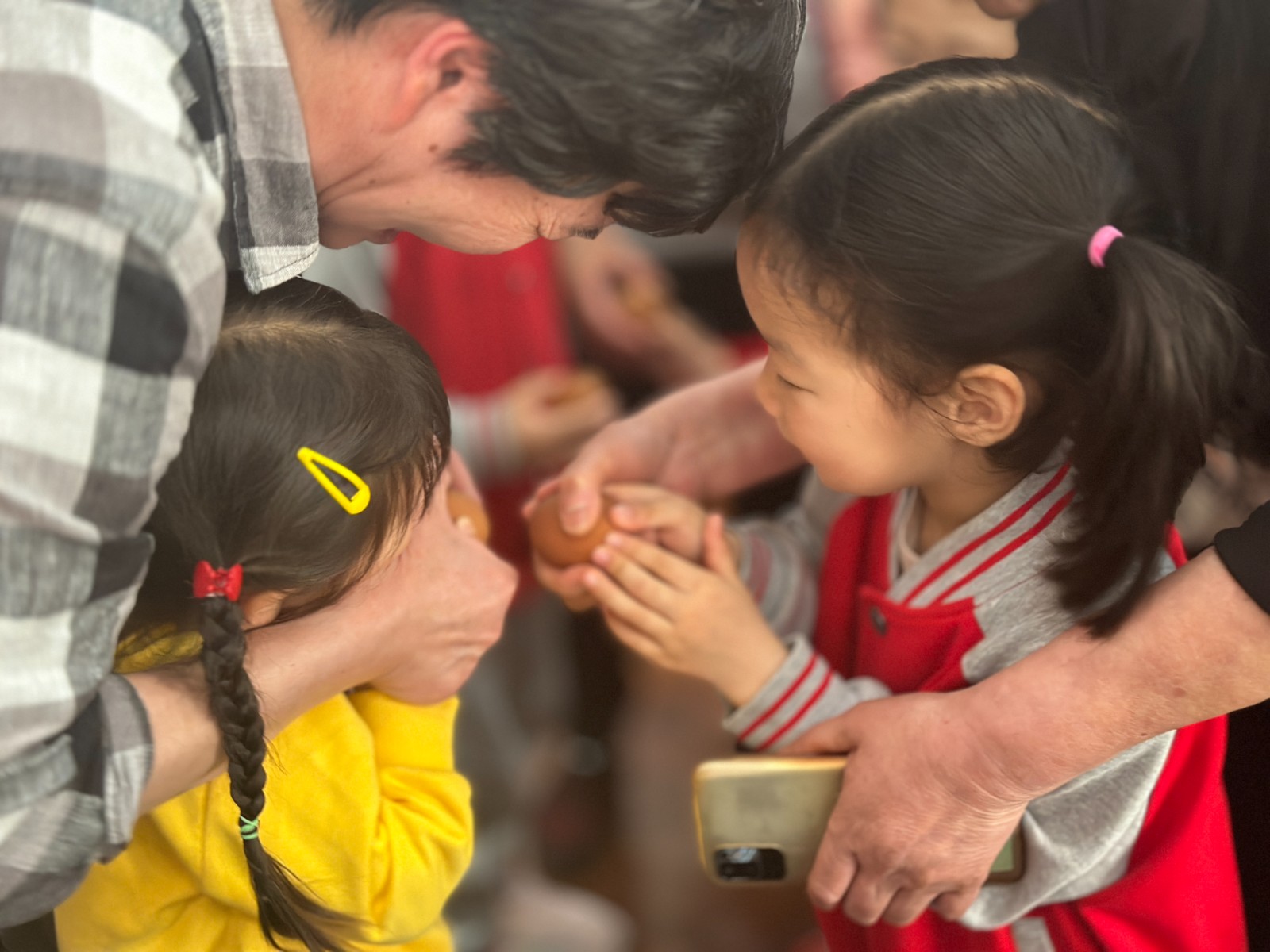 到了下午孩子们放学的时间,社区首届“蛋王争霸赛”就开始了,孩子们一个个摩拳擦掌,挑选出自己认为最坚硬的蛋上场比赛,他们手握立夏蛋,用尖头对准尖头相互碰撞,在孩子们的欢呼中,“蛋王”出炉了!阿姨们拿出下午编织的立夏蛋套装上蛋挂在孩子们身上,一起留下了难忘的合影。