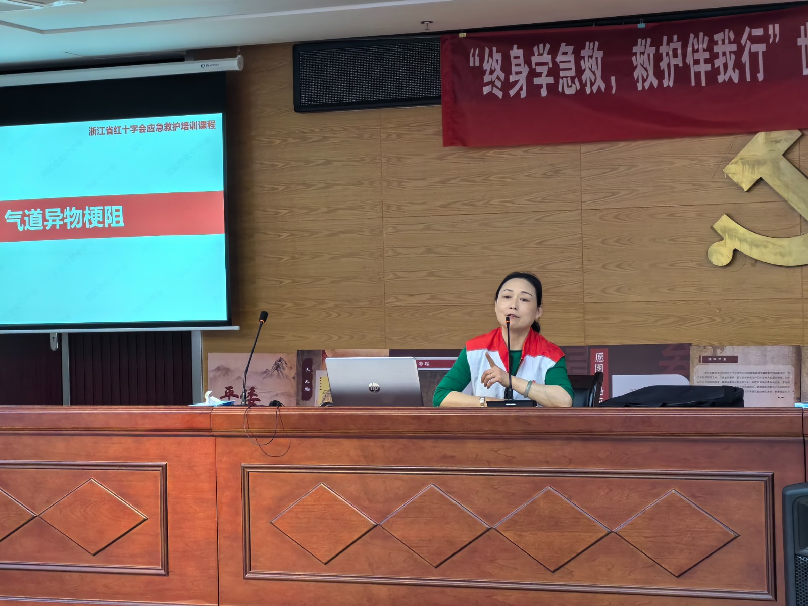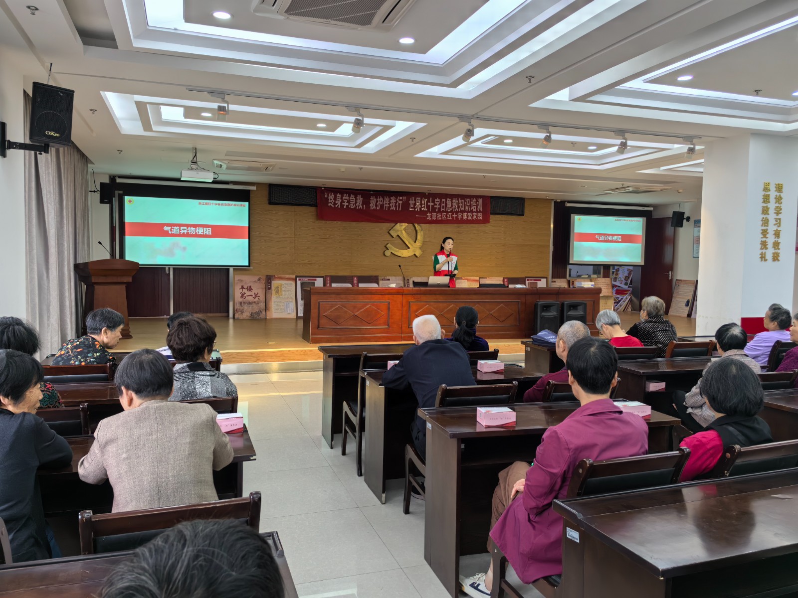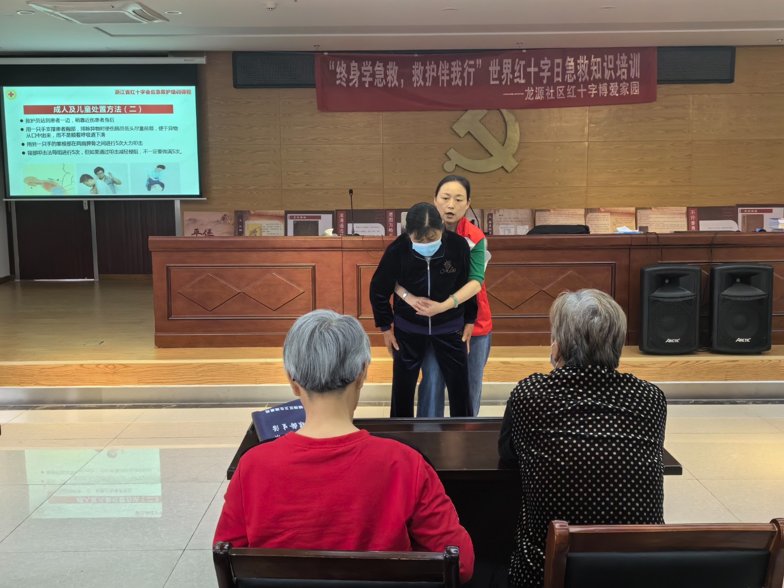 区红十字老师现场指导气道异物梗阻时的急救办法:掌握成人儿童气道异物梗阻的急救办法和单独在家时如何自救,了解孕妇等特殊人群不适合腹部冲击的急救办法,教会大家掌握海姆立克急救正确使用手法。