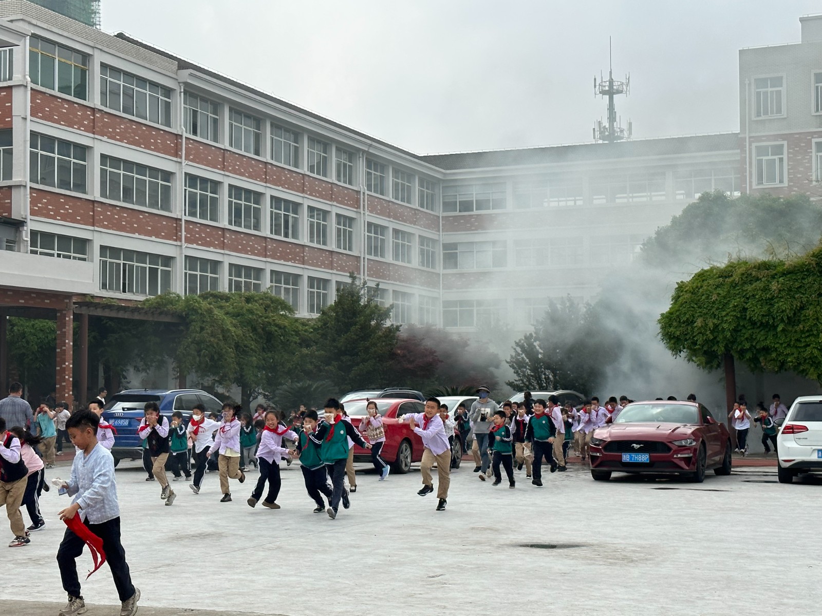 随着消防警报的响起,演练正式开始。全体学生按照预案明确分工,以班级为单位,网格员有序组织同学们分方向、按路线迅速撤离到到达后操场后,到指定位置就座。演练过程中,学生们有序下楼逃生,做到:“弯腰、扶墙、捂口鼻”。全体师生低头弯腰有条不紊地迅速撒离。随后,来自尖峰救援队的杨松队长带领他的团队向全校师生普及了消防安全知识,如在现场对伤者进行急救以及灭火器的使用。
