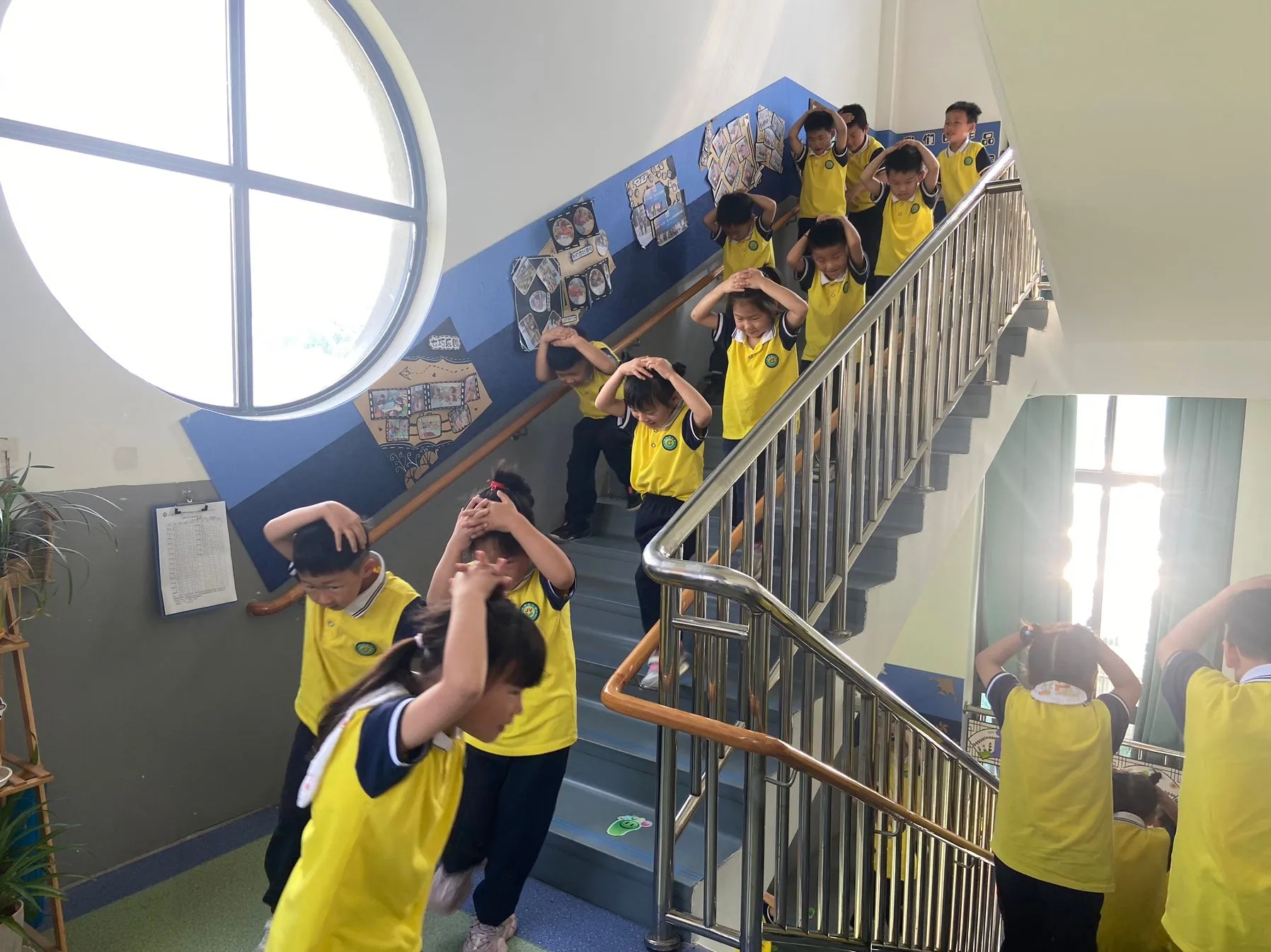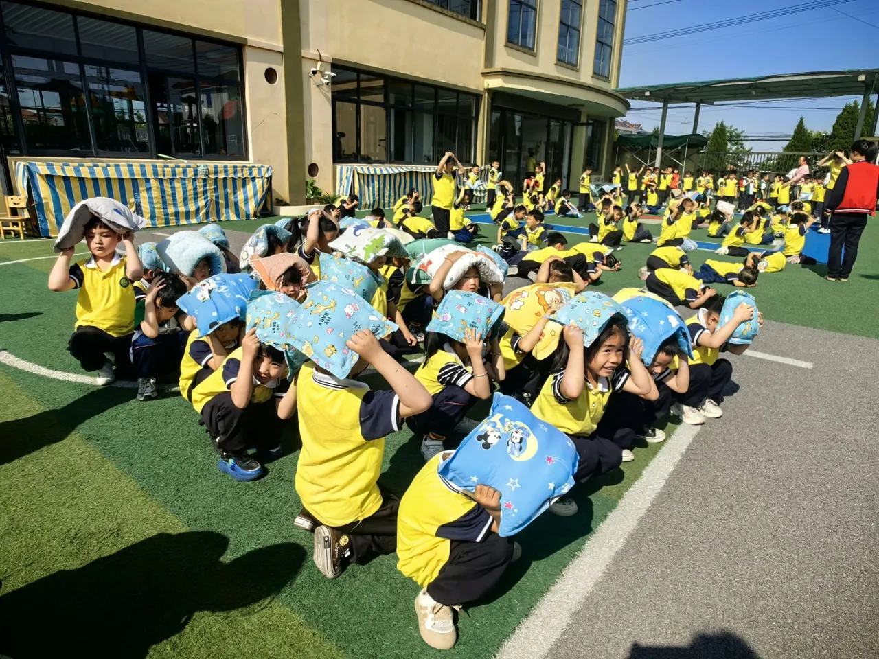 有的幼儿双手护住头部,弯腰低身,沿着预定安全路线快速、有序地疏散到室外安全空旷操场。