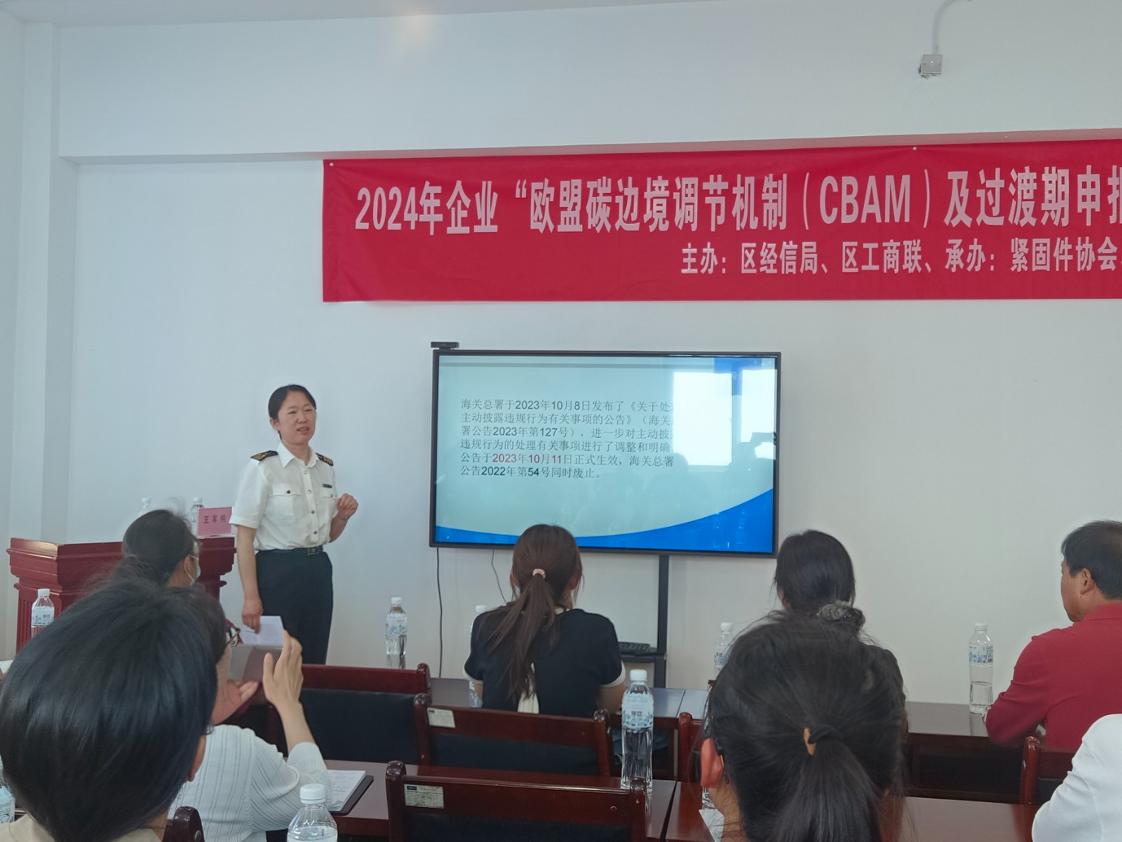 随着全球环境问题的日益严重,人们对于生态环保的意识不断提升,绿色制造是未来发展的方向,低碳经济和绿色发展全球经济发展的主题。为推进镇海区高质量绿色发展,帮助辖区内进出口企业了解掌握双碳相关政策以及海关127政策514九龙湖成校联合九龙湖紧固件协会、九龙湖商会协助区经信局、区工商联举办2024年企业“欧盟碳边境调节机制(CBAM)及过渡期申报暨海关相应政策”培训培训特邀中国环境学会、国家气候中心双碳专委会委员王军纯和海关稽查科科长逄颖授课。