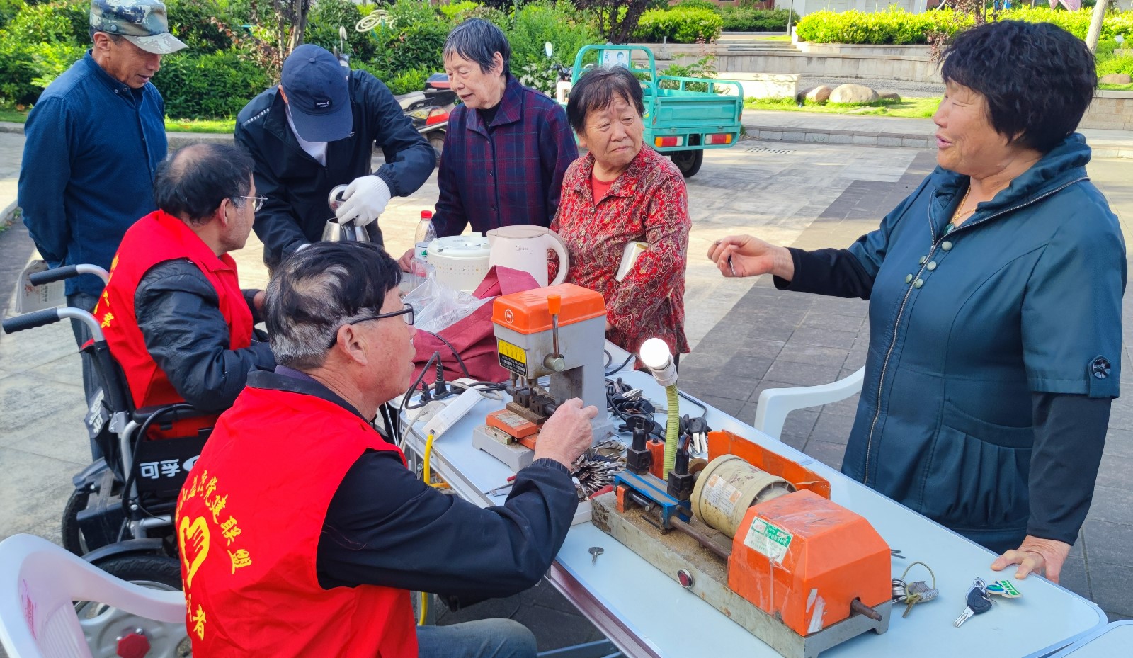 小家电修理现场,居民一边等待修理,一边饶有兴趣地观看修理过程,“来帮我电饭煲倒点水。”“您看水够了吗?”,等待得居民相互帮忙,气氛融洽。
