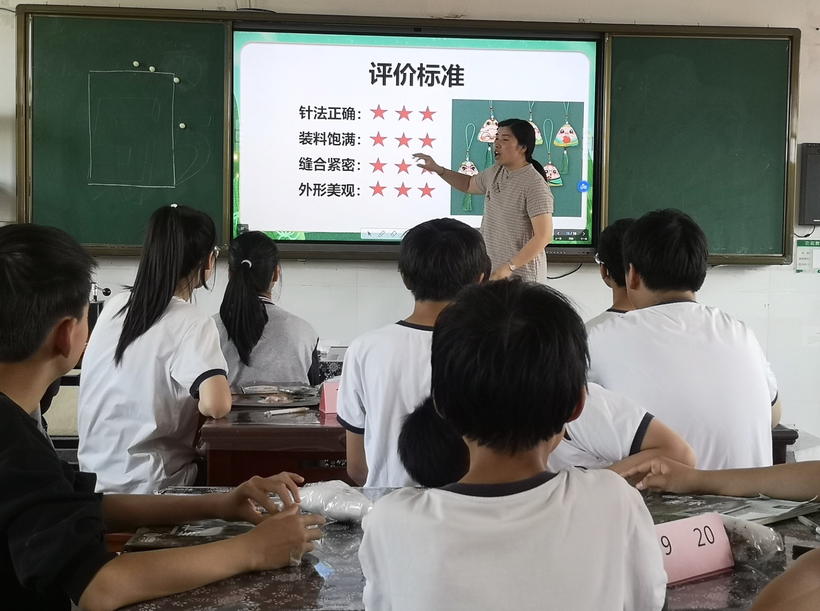 【以课为例,以教促研】本次活动中,首先由慈溪市胜山初级中学张智艺老师为大家呈现了一节《端午传统习俗——制作香囊》精彩的劳动课。为继承文化遗产,弘扬中华民族优秀传统文化,让学生在劳动中深切地感受到传统节日的独特魅力,在张老师的讲解示范下,学生们纷纷开始动手制作香囊:穿针、引线、打结、裁剪、挂珠串儿、装香料、缝合……大家一会儿向老师请教做法,一会儿跟同学讨论步骤,一个个五彩缤纷、饱满精致的香囊就“新鲜出炉”了。
