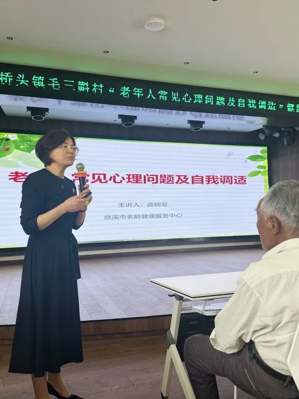 为了增强老年人的自我保健意识,树立科学健康的生活方式,提高老年人对心理健康问题的认知和应对能力,近期毛三斢村在桥头成校的指导下邀请了慈溪市老龄健康服务中心的虞婉亚和吴晶老师开展了关于“老年人常见心理问题及自我调适”的健康讲座。