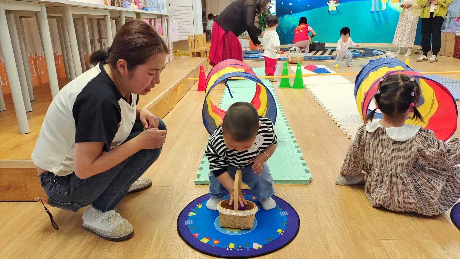 到了大家最期待的障碍赛环节,在老师演示结束后,宝宝们纷纷站好位,迫不及待地向前冲,他们抓起栏里的海洋球,走过平衡木,跨过栏杆,爬过一条彩虹隧道,凭借自己的努力到达终点,将胜利的“果实”放入框内。最后环节是考验家长与宝宝的配合,在一声声的加油助威声中,妈妈们带着宝宝出发。比赛现场的气氛相当活跃,充满着家长与宝宝的欢声笑语。