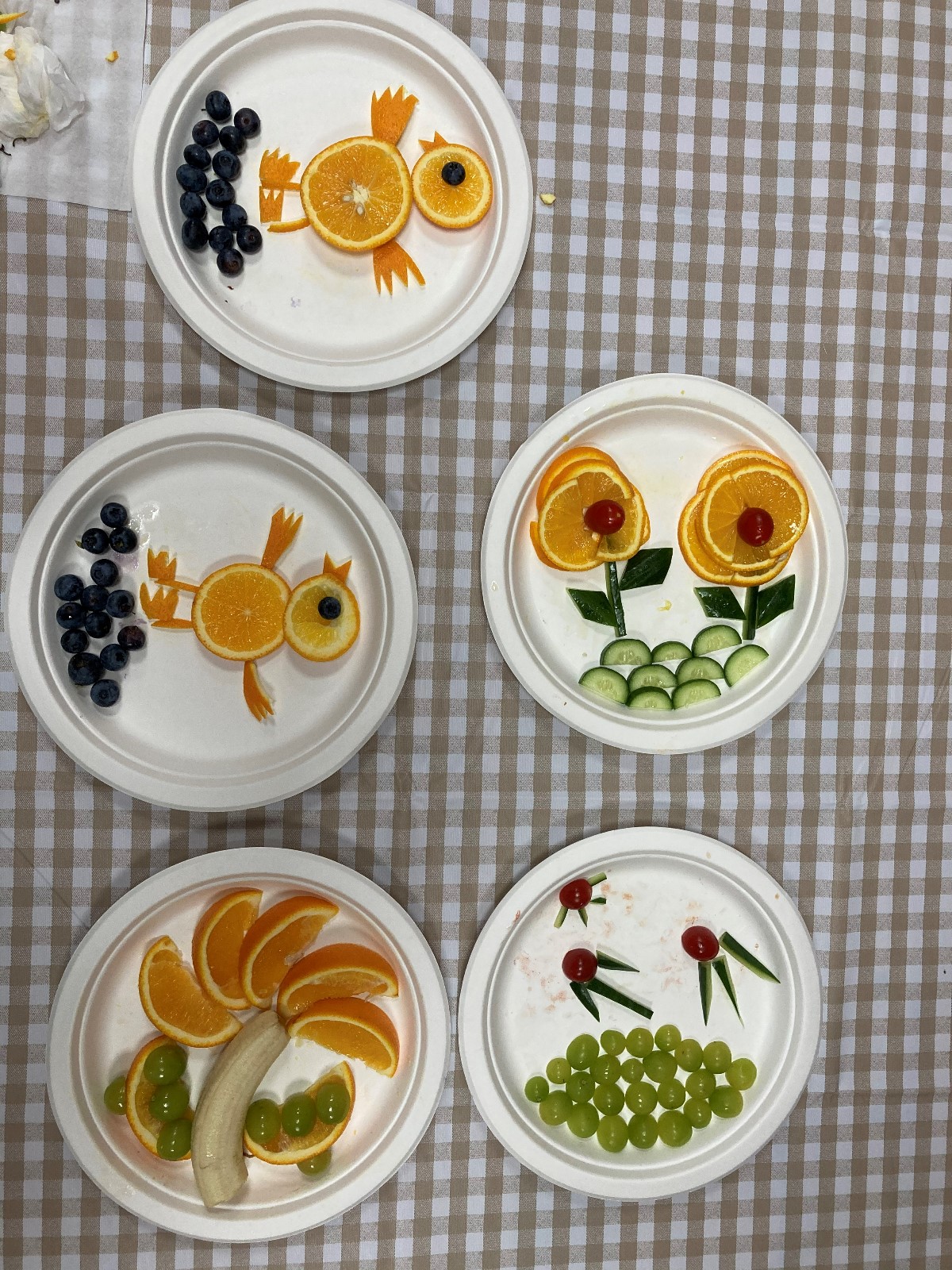 活动现场,五颜六色的水果摆满了桌子,家长们和孩子们纷纷动手,拿起水果刀、勺子等工具,开始精心制作各自的水果拼盘。在制作过程中,家长们不仅耐心地指导孩子们如何切割水果、如何摆放更美观,还鼓励孩子们大胆尝试,发挥想象力。孩子们也表现出了极高的热情和创意,有的用香蕉摆出小船的形状,有的则用苹果雕刻出小动物的头像。整个活动现场充满了欢声笑语,亲子之间的默契和合作让人倍感温馨。