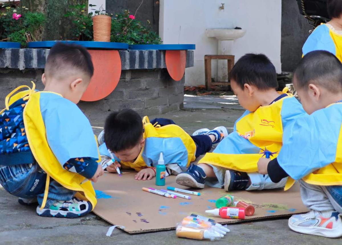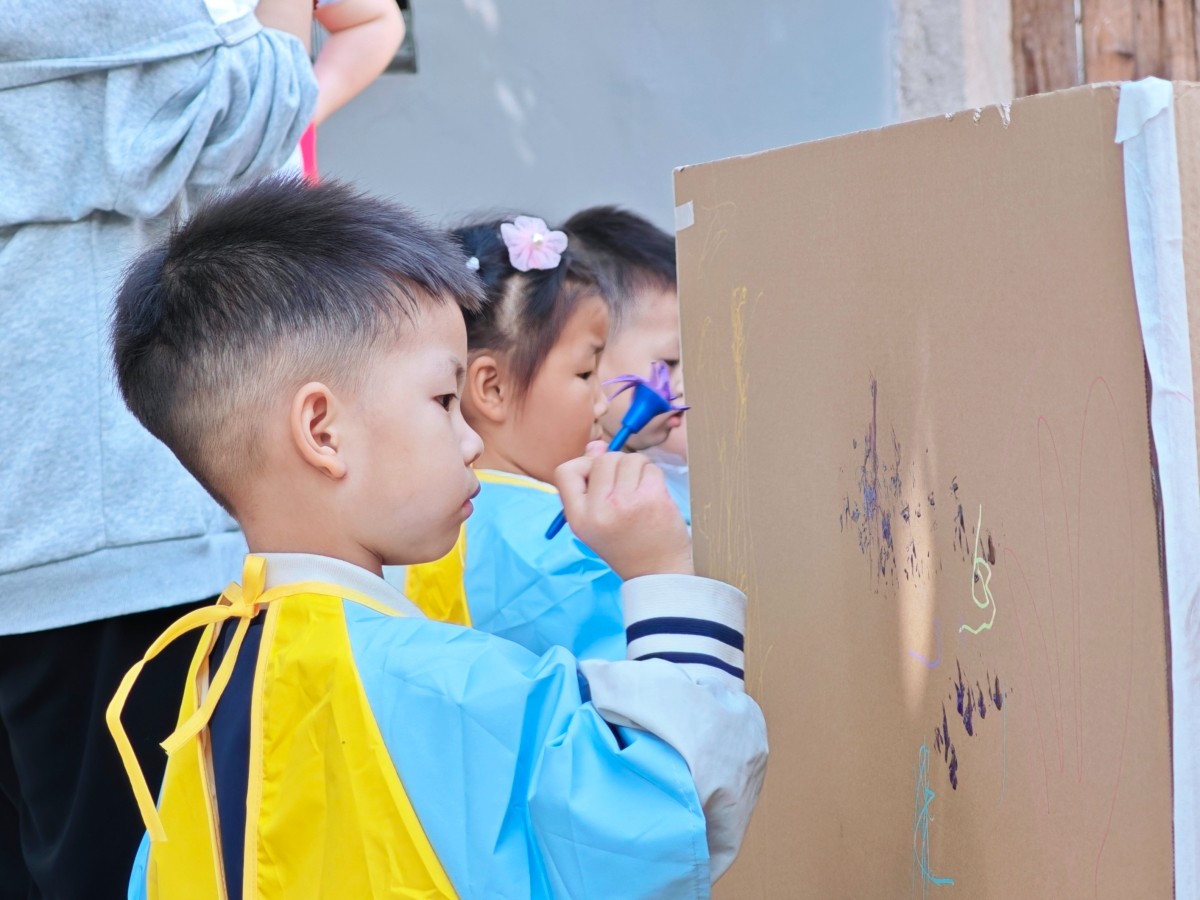 “老师,我把自己的手掌印在纸盒迷宫上了”“妈妈,我把掉在地上的树叶涂满颜料,印在上面”......孩子们没有绘画的技巧,但有着天马行空的想象。