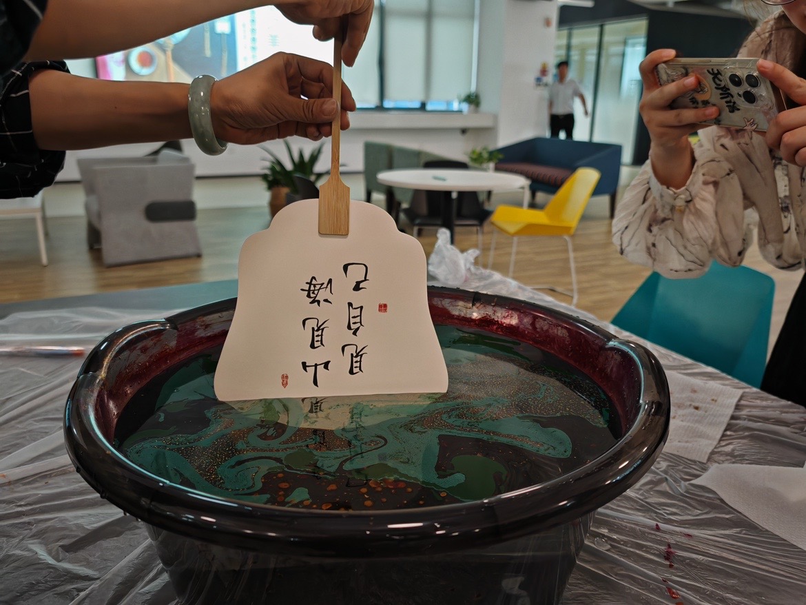 老师先进行了简单示范,之后为每位参与的学员发放制作工具和材料。大家小心翼翼地将调好的大漆滴在水中,划一划,凑近仔细观察,一个轻微的动作,都能让纹路随机变换。各种颜色相互交织在一起,形成各异的图案,接着把握好角度,使扇子缓缓下水,再提起,属于自己的漆扇便大功告成。