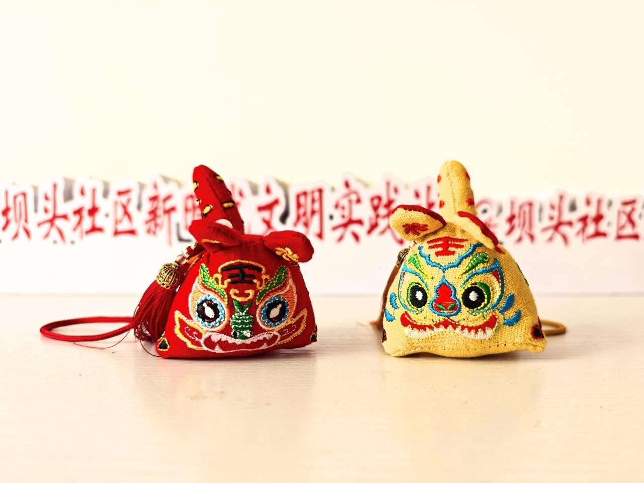 巧手来回穿梭,针线飞舞在绣面上,眼前一只虎头图案若隐若现。将草药粉装入香包中,扎好袋口,并用彩绳盘成精美的盘扣装饰……“这个针脚怎么缝制?”“收口怎么收?”“这是怎么翻过来的?”大家相互讨论互帮互助,现场其乐融融,一个个立体饱满又精致的香囊制作完成,香囊清幽的香气弥漫开来,沁人心脾。“听说社区有个虎头鞋非遗工作室,我们平时也喜欢做些手工艺,今天也算是慕名而来的吧。”参加活动的王明慧开心地说道。