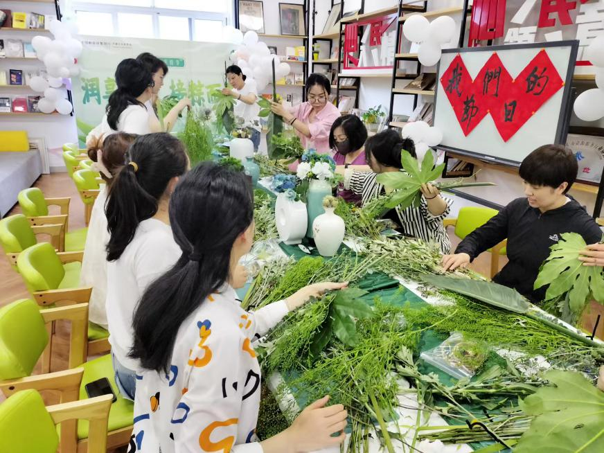 活动开始,花艺老师一边讲解,一边现场示范艾草花束制作的基本流程。在志愿者的帮助下,职工们一步一步按照讲解步骤开始制作。大家一边动手挑选艾草和配花,充分发挥想象力和动手能力,自行设计造型,把端午的美好祝福倾注在花束之中,一边相互交流制作花束的心得,聊着端午习俗,分享有关端午的趣事。