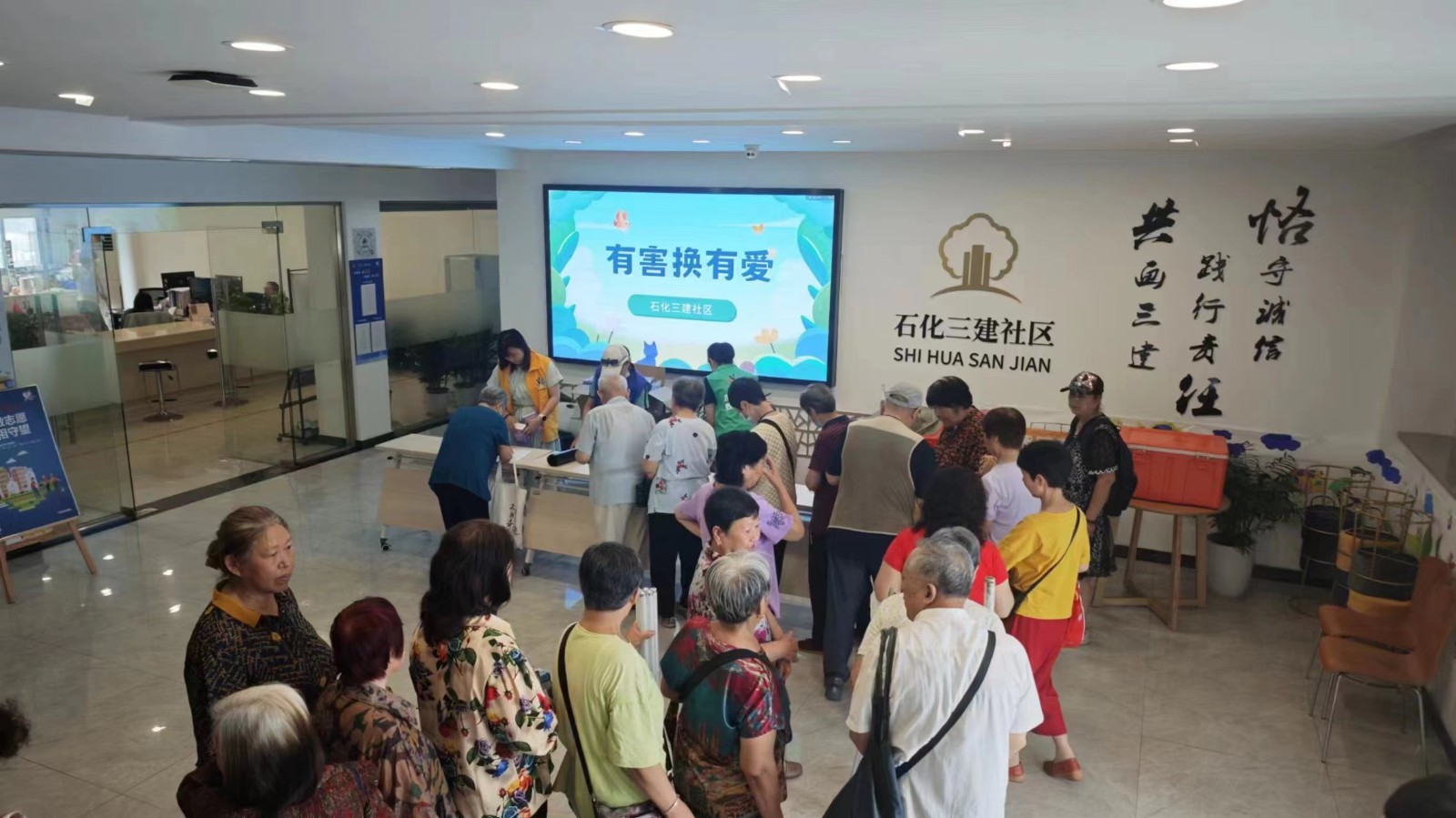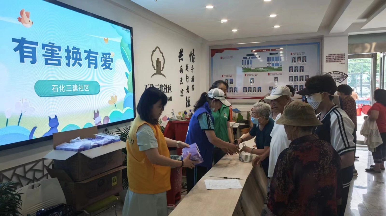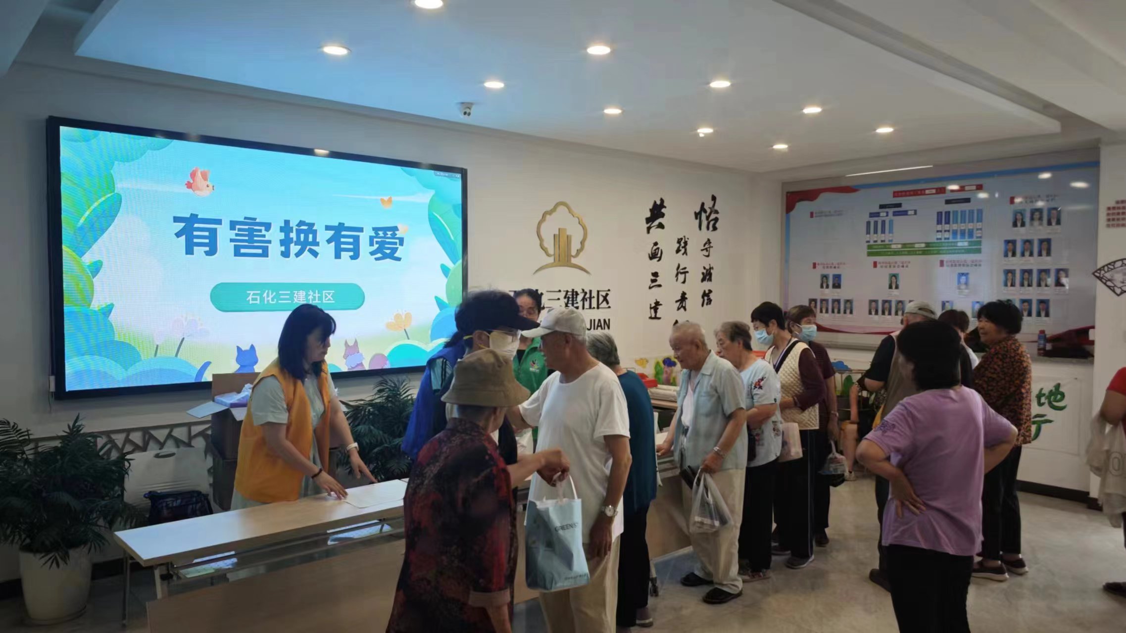 6月21日上午,石化三建社区开展每月一次“有害换有爱”活动,小区居民们一大早就将提前收集起来过期药品、X光、废电池等有害垃圾拿到社区来兑换。通过“有害换有爱”的活动鼓励居民们将有害垃圾单独分类,提高大家自觉参与垃圾分类的意识,在日常生活中养成垃圾分类的好习惯。
