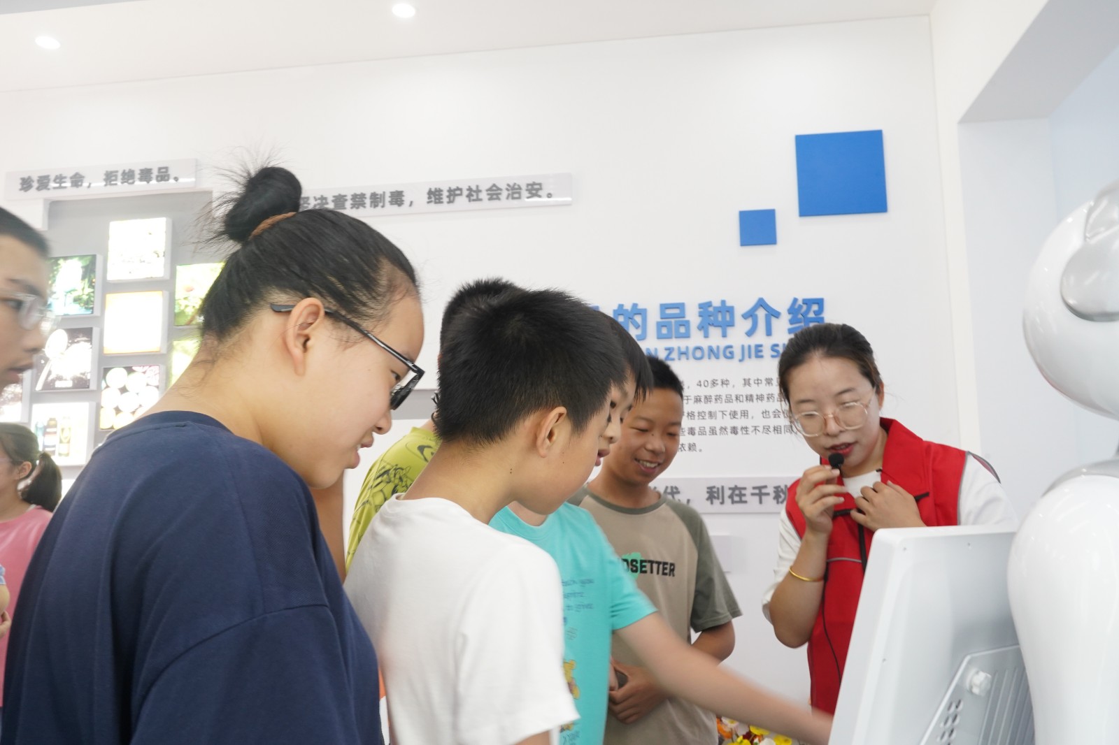在禁毒科普馆中,讲解员带领学生走进科普馆引导学生通过观看仿真毒品、实物资料、图文音像及禁毒VR、虚拟毒驾体验等形式,了解禁毒工作重要性。