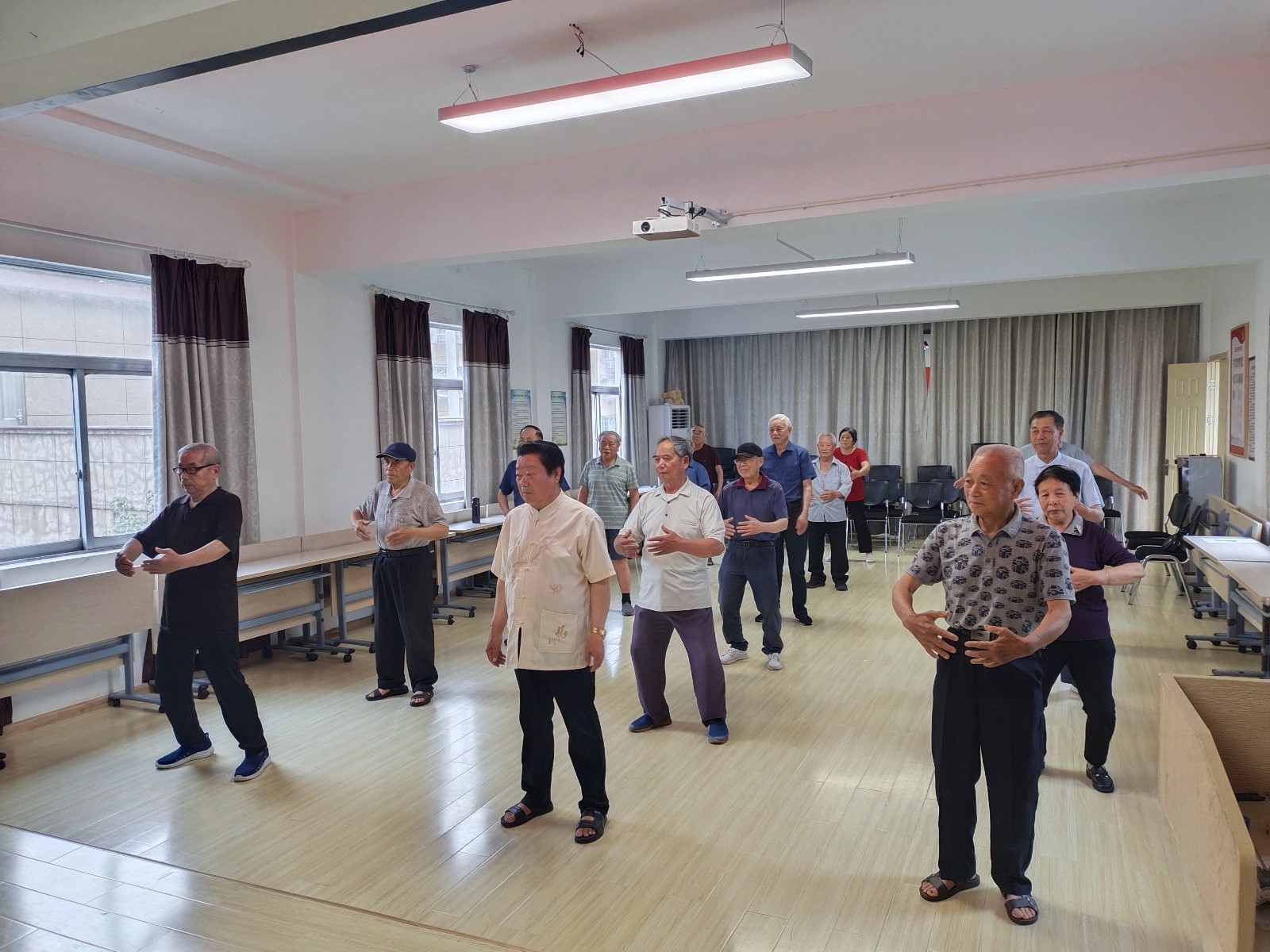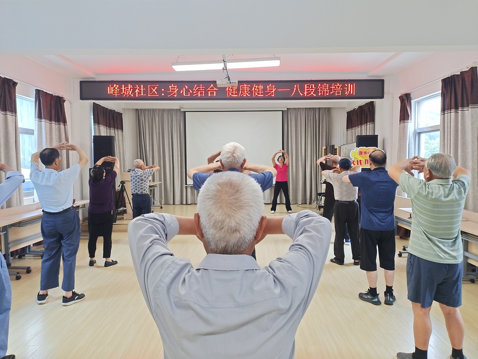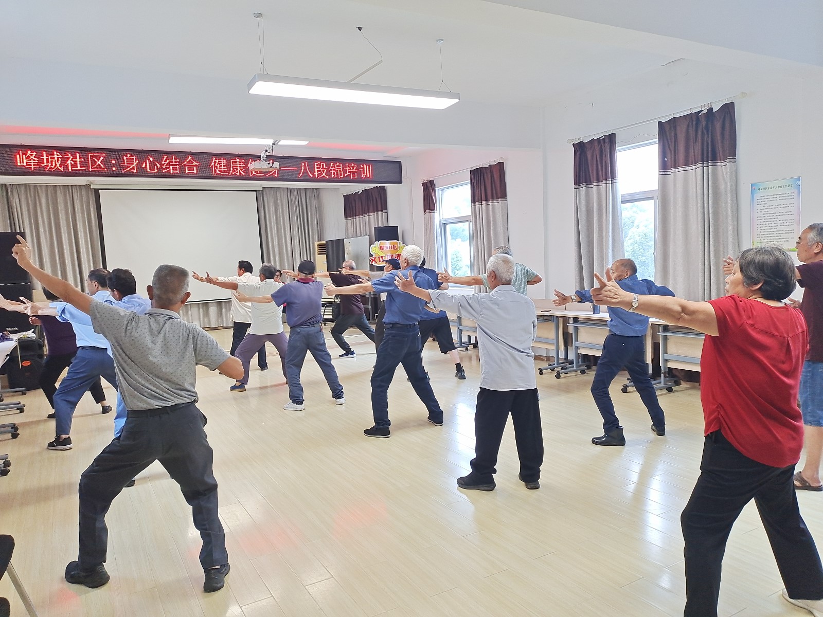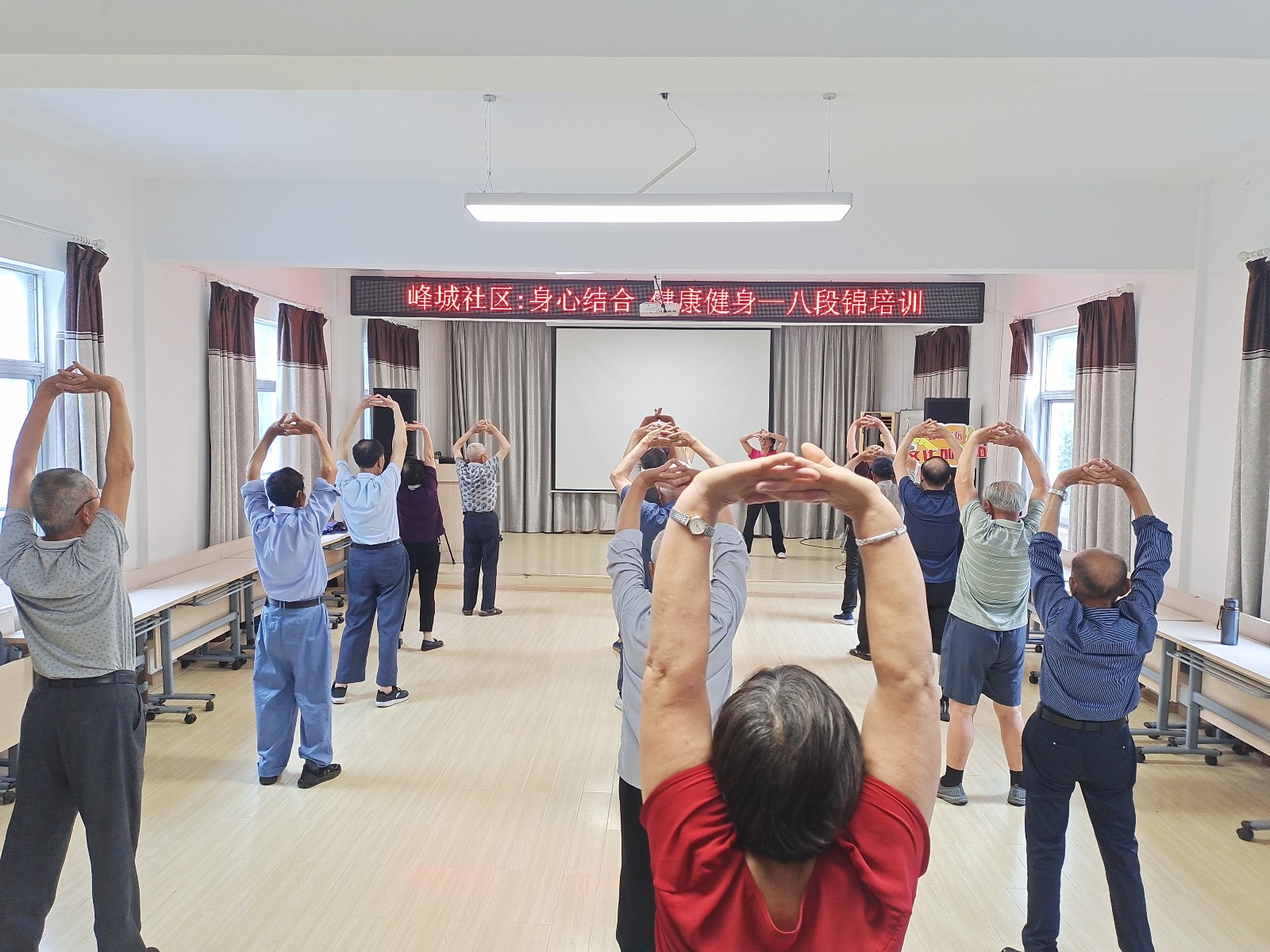 为提高辖区老年人的健康水平,丰富辖区老年人的业余生活,6月26日下午,峰城社区党群服务中心联合社区新时代文明实践站开展八段锦健身功法公益课堂,吸引了辖区20余名老人参加。