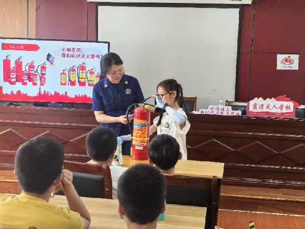 课上,北仑区消防救援大队的老师通过生动的案例和形象的演示,向同学们讲解暑期中常见的安全隐患及消防安全常识,提醒孩子们在假期中要要养成良好的火灾防范习惯,不随意玩火,不乱丢垃圾,不私拉乱接电线,以免引发火灾。还与同学们现场互动,演示如何使用灭火器、如何正确报警、如何逃生等实用技能。通过实际操作,孩子们对消防安全有了更加深入的了解和掌握。“大家一定要记住,当火灾真正来临时,你们在还不会保护自己的情况下,并不提倡参与救火。一个字,跑!拨打 119!”单老师反复叮嘱着,她的声音中充满了关切和担忧,孩子们则全神贯注地听着,眼神中流露出对知识的渴望。