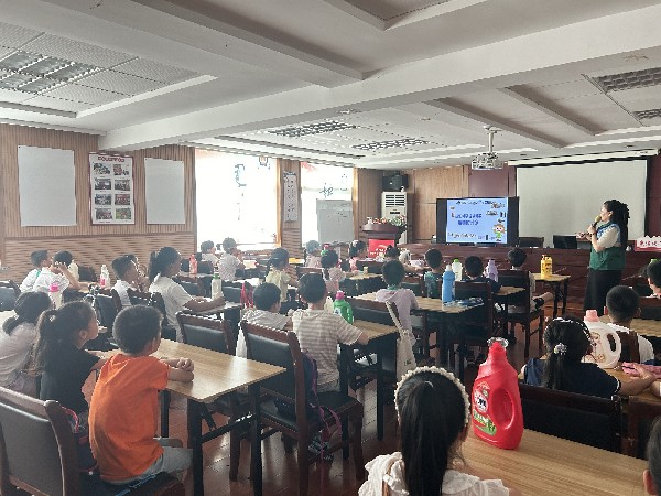 活动中,老师首先向孩子们详细介绍垃圾分类的标志,垃圾的种类以及如何进行垃圾分类通过现场提问、诵读垃圾分类歌曲等方式来增强大家的环保意识,用寓教于乐的方式将垃圾分类的理念根植于孩子们心中。鼓励在座的小朋友们在日常生活中积极参与垃圾分类,也可以通过利用废弃物品制作出有用的工艺品或装饰品,从而实现资源的再利用和节约。随后,师向孩子们展示了利用洗衣液瓶制作的小手工,通过详细讲解制作步骤和要领,让孩子们发挥想象力,完成属于自己的洗衣液瓶大改造。小朋友们通过等技巧将自己的洗衣液瓶改造成独特的手工作品。整个活动充满了欢乐和畅想,大家相互展示,享受着成功的喜悦。
