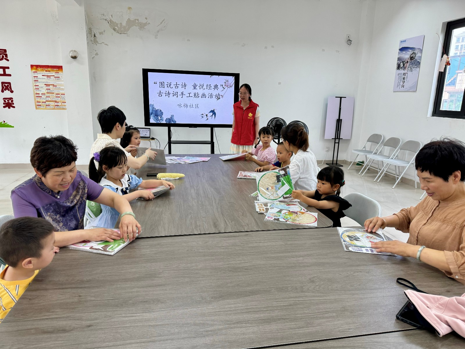“我来念一首,‘小荷才露尖尖角,早有蜻蜓立上头。’”“轮到我了,我要讲一个经典故事......”活动现场,孩子们稚嫩的声音此起彼伏,互相分享着各自学到的经典诗词跟神话故事。到了手工环节,网格员和志愿者拿出了一早就准备好的古诗词贴画手工制品,孩子们在父母的帮助下把自己喜欢的颜色和图案填充到画板上,再贴上自己喜欢的诗词,一个个活灵活现的贴画就诞生了。这个环节不仅能激发孩子对经典故事的兴趣,加深他们对诗词的印象,还能培养孩子们的动手操作能力。
