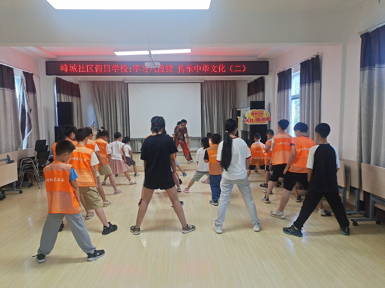 “左脚开步,与肩同宽。屈膝下蹲,掌抱腹前。中正安舒,呼吸自然。心神宁静,意守丹田。”7月10日上午,峰城社区假日学校的教室里,小朋友们在白峰街道武术队骨干老师贺如娟的教授下,一丝不苟学习着八段锦,传承非遗文化。