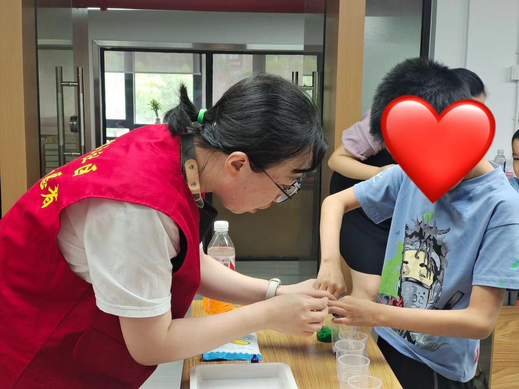 活动中,社区微光志愿者首先带领星宝们团队接力运水给玩具洗澡的小游戏形式,教授星宝们学习舀水、端水、倒水等基本动作。随后开始《水车大实验》,星宝们在家长一对一辅助下,将雪花片拼接成一个水车叶轮,插上塑料棒。用积木搭建起两个支架,将水车叶轮架在中间,模拟水车就做好了。志愿者给每组家庭准备水瓶,教星宝把水杯举起,对准水车叶轮慢慢往下倒,小水车果断转起来啦。中场休息间大人、小孩开始呼呼吹泡泡、追泡泡、抓泡泡,一串串七彩的泡泡装满了小朋友们的童真和童趣。泡泡游戏结束,就要开始七彩泡泡《小苏打与白醋的奇遇》科学实验了,亲子家庭根据志愿者的讲解,将小苏打分装倒进容器中,加入各色染料,然后小心翼翼地倒入白醋,伴随着“嘶嘶”声响,容器中产生大量五颜六色的气泡,在玩乐中创作出一幅幅岩浆画。