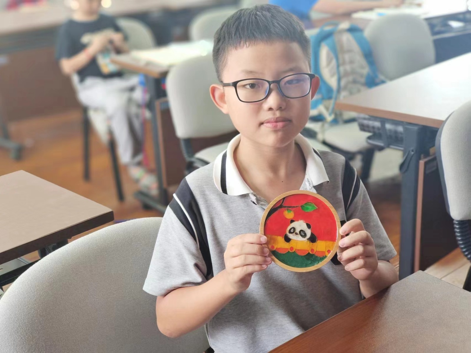 在制作环节,来自瞳瞳亲子派服务中心的糖果老师现场教学掐丝珐琅手工画之国宝熊猫。经过老师耐心细致的讲解以及生动的演示,同学们纷纷动手操作起来,将金丝捋直、弯折成所需的形状,掐在相应的花纹胶上,最后小心翼翼地将彩砂填满图案。看似简单的操作,需要极大的耐心和细致的动手操作能力。经过两个小时的努力,一只只憨态可掬的国宝熊猫诞生了,同学们相互展示着自己的作品,脸上洋溢着满满成就感,教室里充满着欢声笑语。
