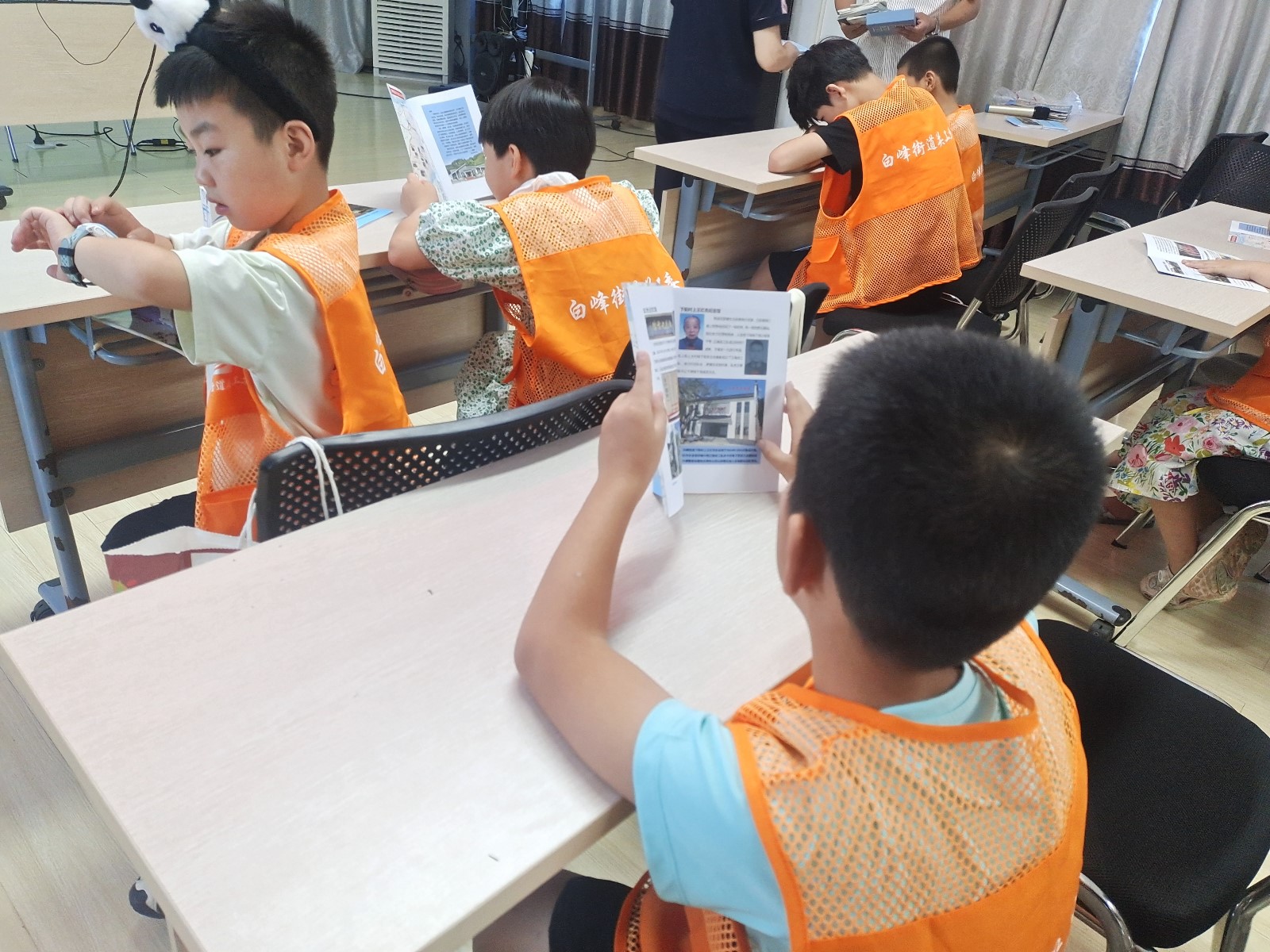 《白峰红色名片》中包含了双石人山烽火台、太平岙敌后抗日据点、白峰革命历史纪念馆、中国上阳地下党小组在下湾成立等系列介绍,新四军历史研究会白峰分会副会长周平东用通俗易懂的语言,讲解着白峰红色记忆分布和红色事迹,通过由浅入深的叙述,简洁化、故事性的方式讲述党从成立到中华人民共和国成立这时期一系列的艰难过程,营造出了浓厚的红色文化氛围,小朋友们一边仔细听讲,一边认真阅读,在阅读中提升精神素养,了解革命先辈们的英勇事迹,树立心中对家乡的自豪感。