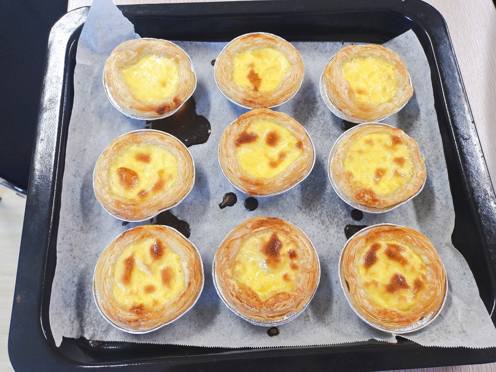 随着蛋挞在烤箱中不断地变得金黄,一阵阵清甜的香味扑鼻而来,小朋友们迫不及待地拿着蛋挞品尝起来。大家边吃边说:“想不到蛋挞是这么做的,自己做的比外面做的还好吃,现在学会了,回家也可以做给爸爸妈妈吃。”