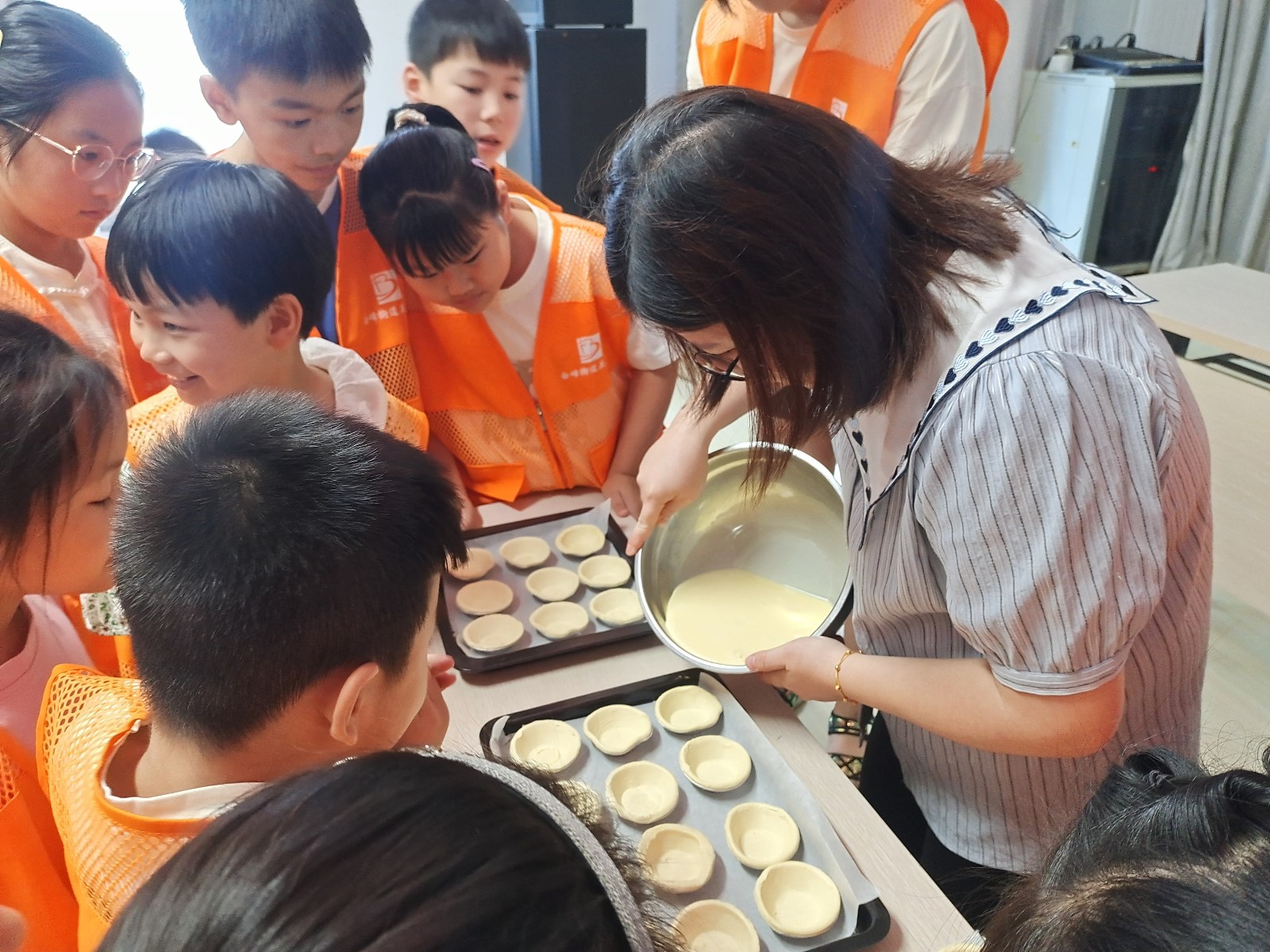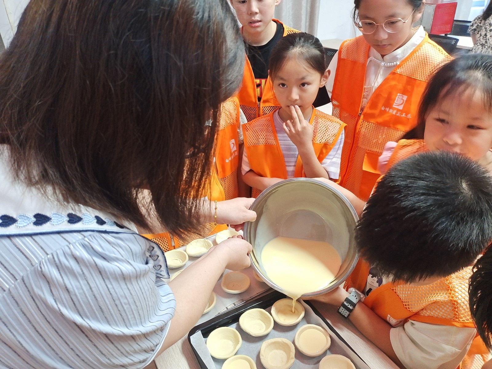 活动开始,社区志愿者将准备好的鸡蛋、牛奶、白糖、蛋挞皮、烤箱等需要用到的食材、工具和蛋挞制作流程为大家进行讲解和示范,孩子们按照志愿者的示范过滤蛋清、搅拌蛋液,再倒入牛奶和白砂糖,然后把搅拌均匀后的蛋液小心翼翼地放进蛋挞皮里。制作过程中孩子们分工合作,配合默契,忙得不亦乐乎。