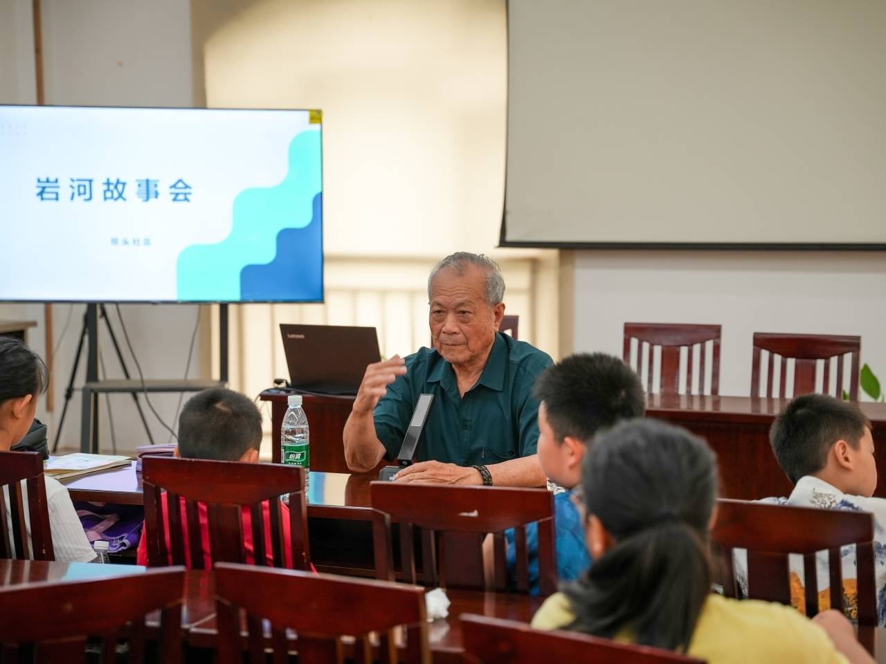 “岩河,不仅滋养着大碶这片土地,更是承载着悠久的历史和深厚的文化底蕴。”一大早,坝头社区五老志愿者陈永江来到社区,通过一场简短的故事会,将他在大碶生活的往事娓娓道来。没有华丽的文案,只有朴实的语言。小学员们仿佛穿越时空,感受着岩河在岁月长河中的变迁与成长,