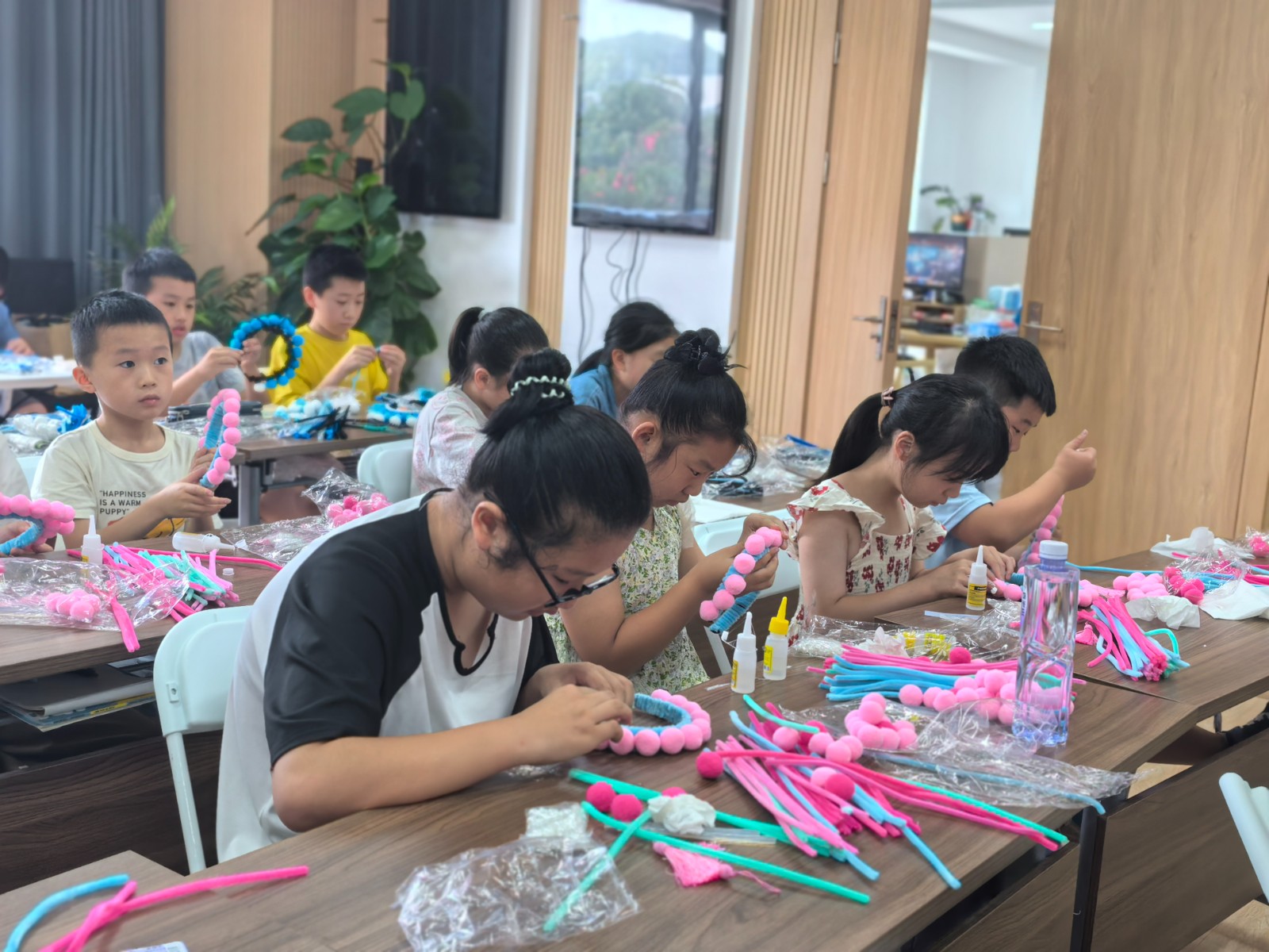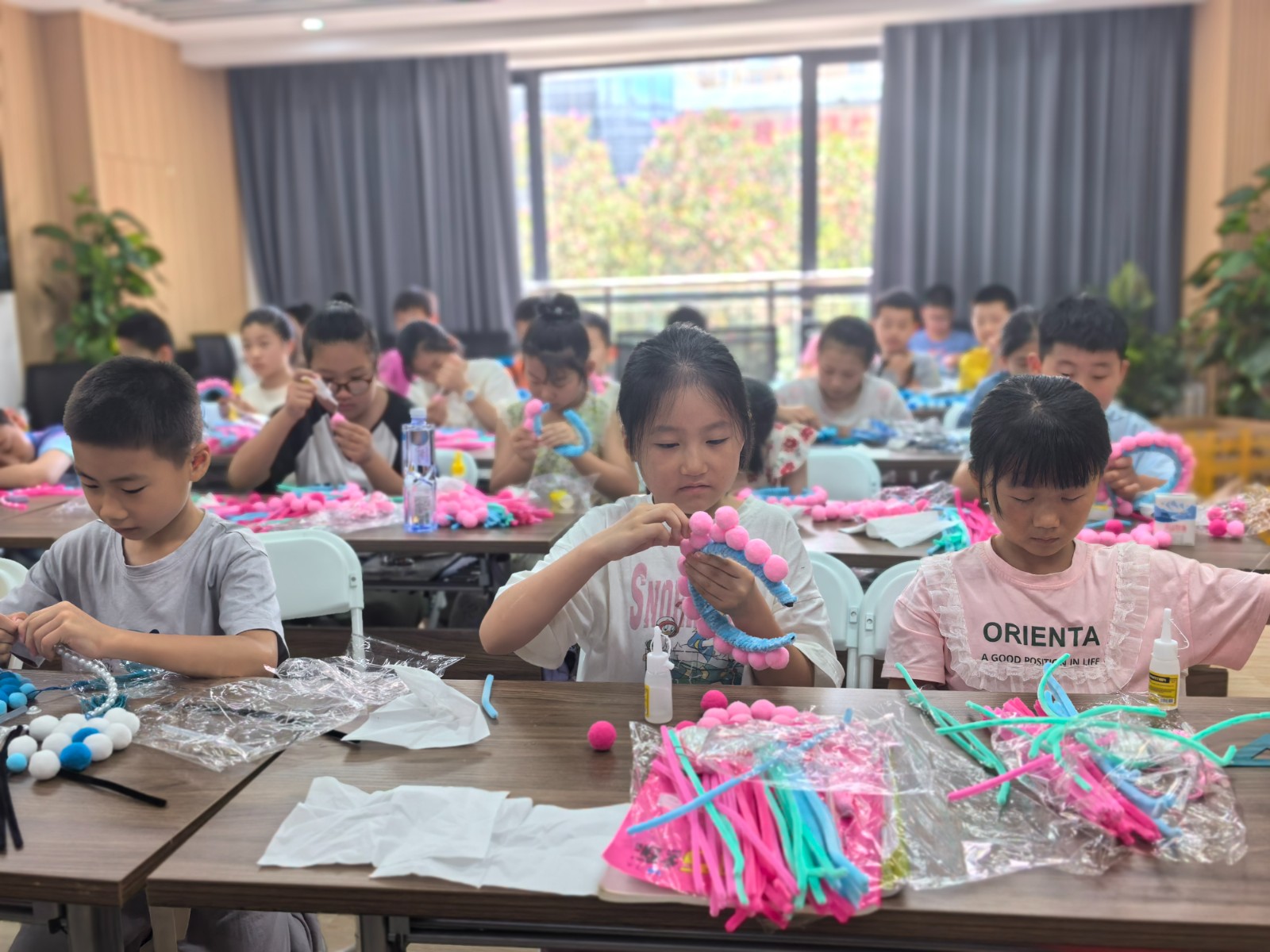 活动伊始,老师为参与活动的孩子们详细讲解了京剧的起源、京剧行头等基础知识,旨在让孩子们对京剧这一非物质文化遗产有更为深入的了解。随后的手工制作环节,孩子们在老师的悉心指导下,利用扭扭棒、彩色毛球、流苏、珍珠等材料,亲手制作出了色彩斑斓、独具匠心的京剧发箍。当孩子们戴上自己亲手制作的京剧发箍时,他们的脸上洋溢着满满的自豪和幸福。