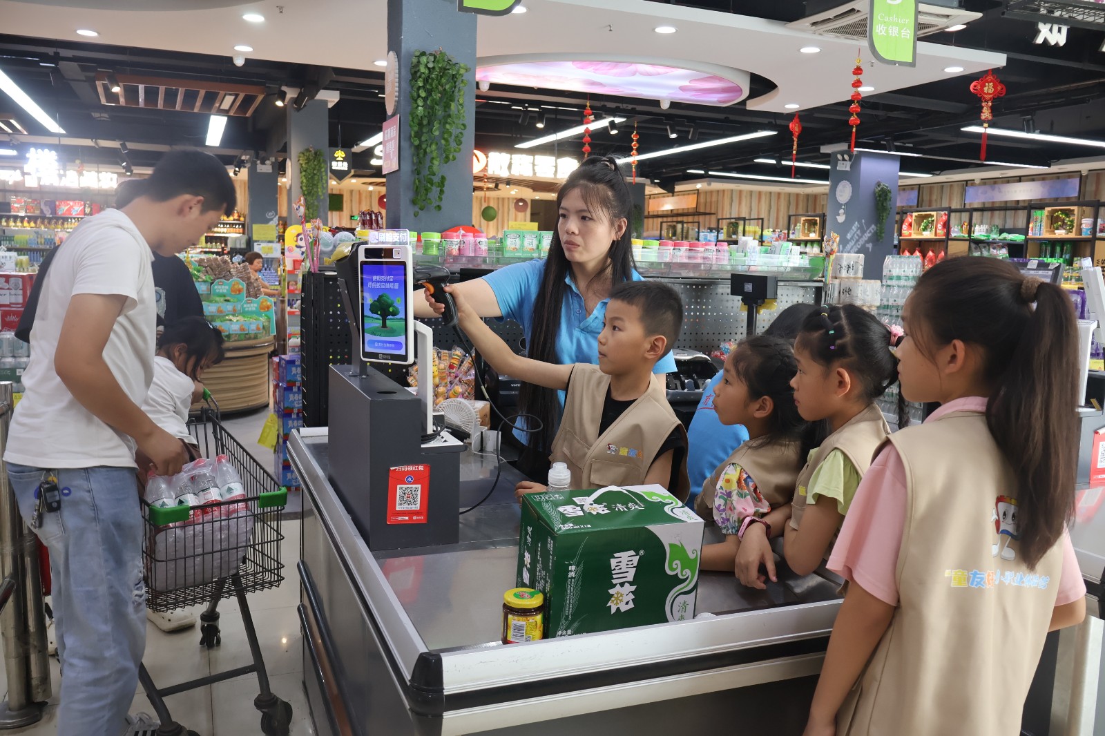 “大家知道我们超市的员工每天要做哪些事情吗?”日初莲花的工作人员正为小小超市打工人们做“岗前培训”。培训后,小朋友化身超市打工人开始了工作。理货、拣货、收银……小朋友们在超市工作人员的指引下,体验了超市的不同岗位,成就感满满!