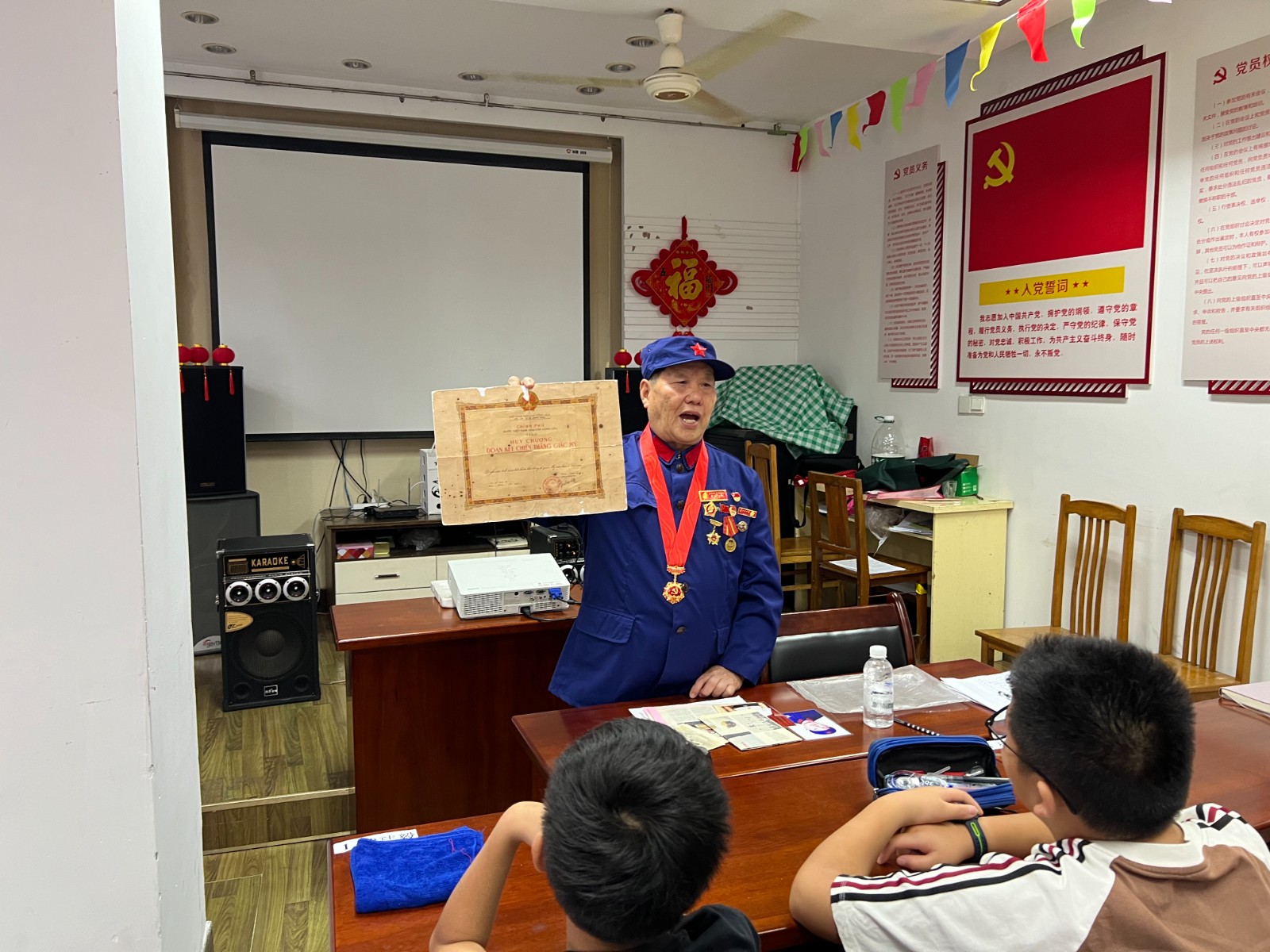 上课现场,气氛庄重而温馨。抗战老兵陈万传爷爷虽已年逾古稀,但眼神中依然闪烁着不屈的光芒,缓缓讲述着他的故事。首先,他讲述了自己年轻时的梦想与选择,如何在国家危难之际,毅然决然地穿上军装,踏上了保家卫国的征途。随后,他详细描述了在前线战斗的艰辛与不易,从日夜兼程的急行军,到与敌人殊死搏斗的惊心动魄;从战友间深厚的情谊,到面对生死考验时的无畏与坚持。每一个细节都饱含深情,让小同学们仿佛穿越时空,亲身感受到了那段历史的厚重与悲壮。