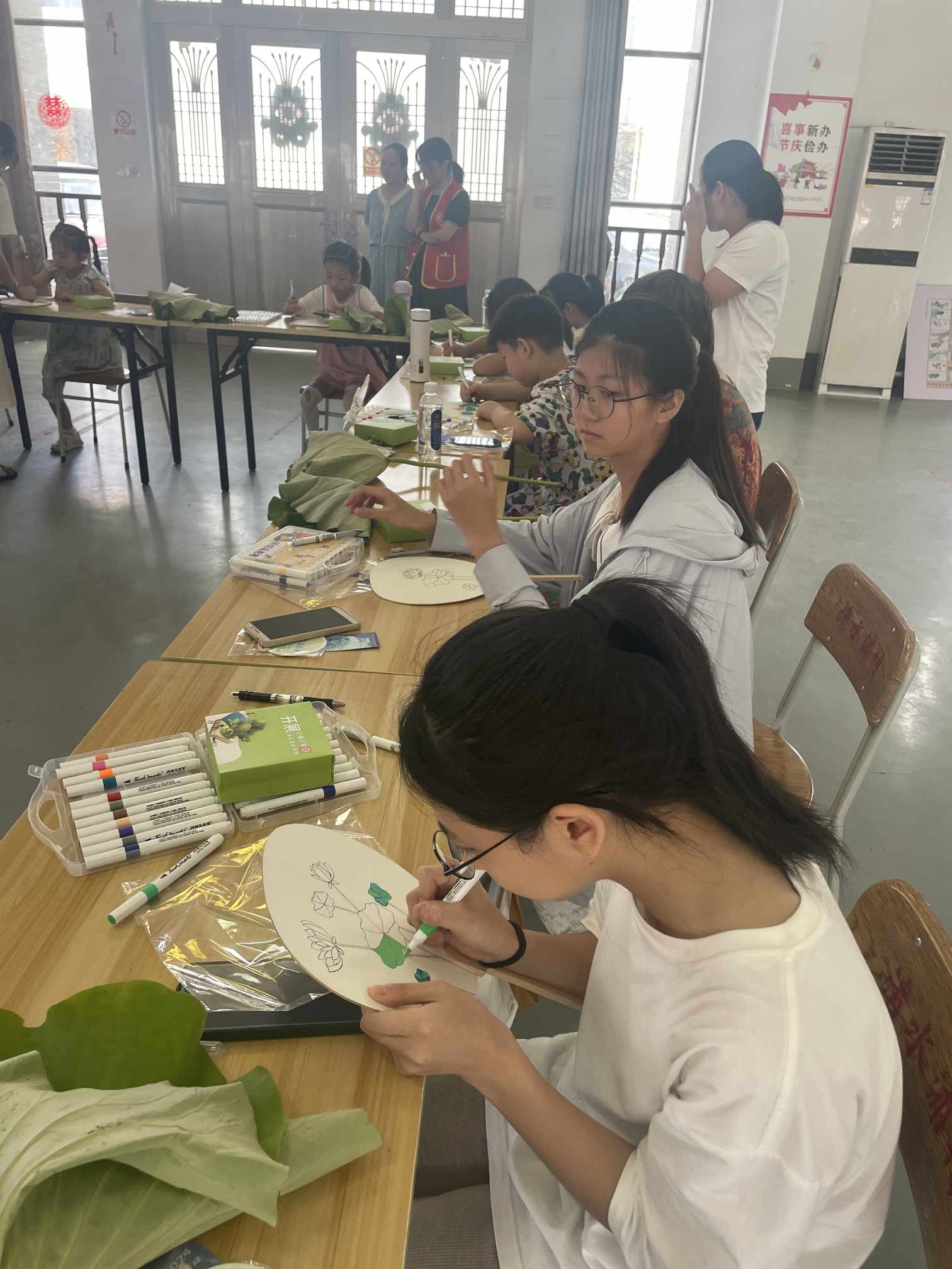 讲解结束后,志愿者们指导小学生们在纸扇上画出自己心中美丽高洁的荷花形象。同学们一笔一画认真地在扇子上作图,用水彩笔仔细地为心目中的荷花上色。