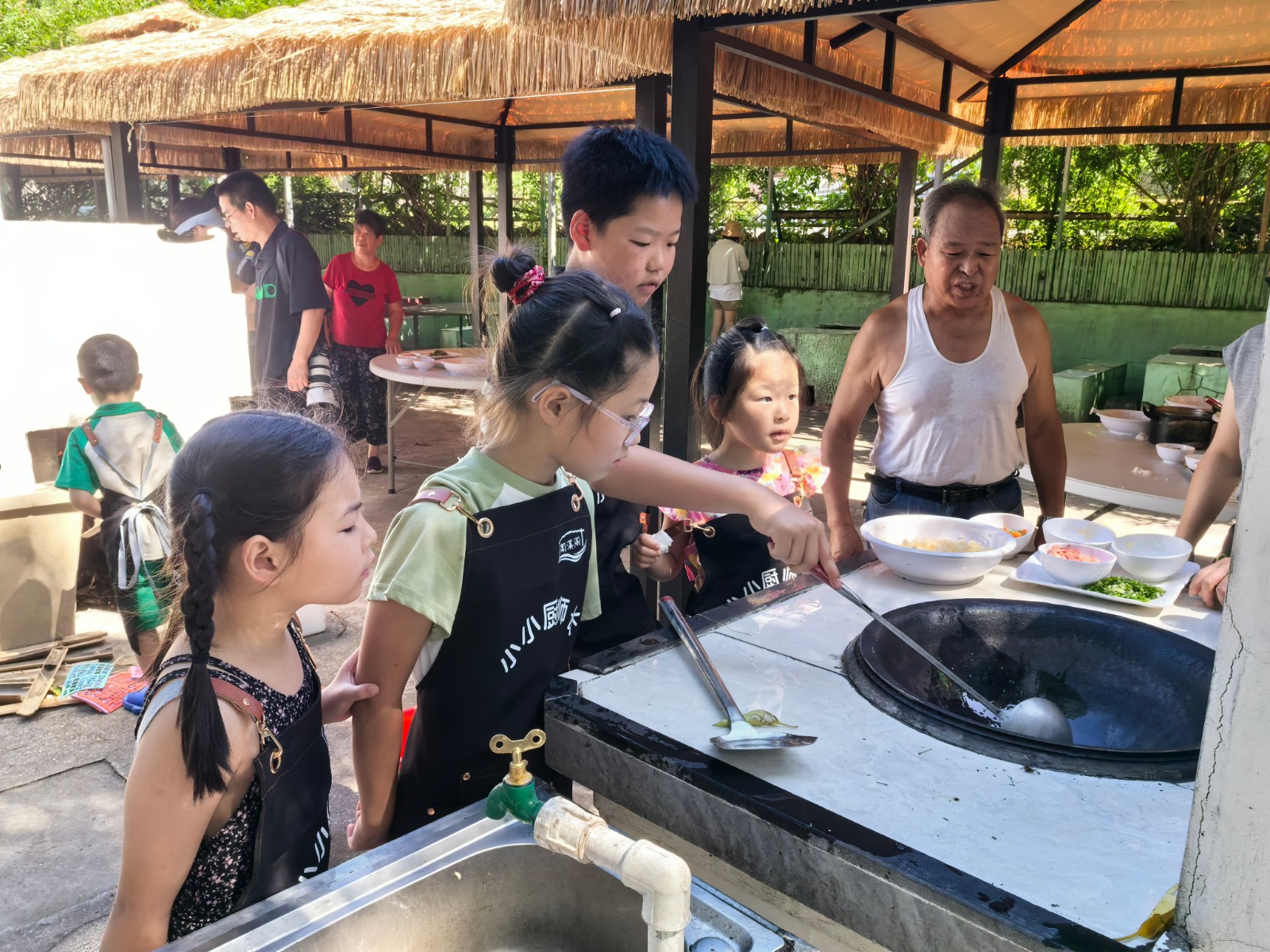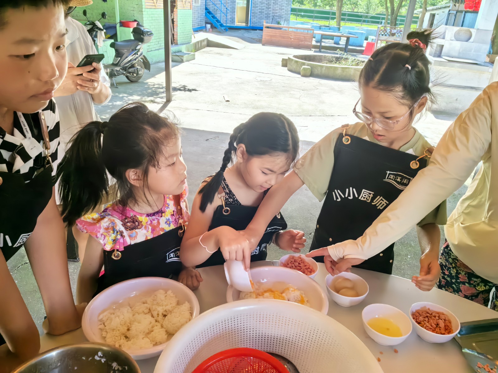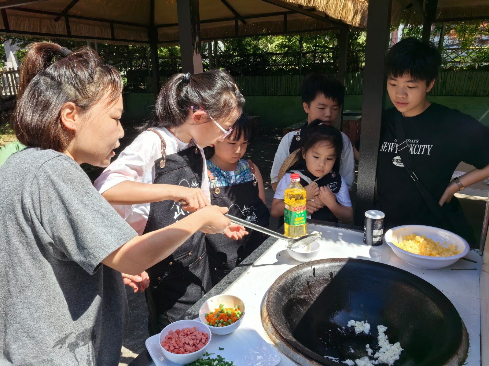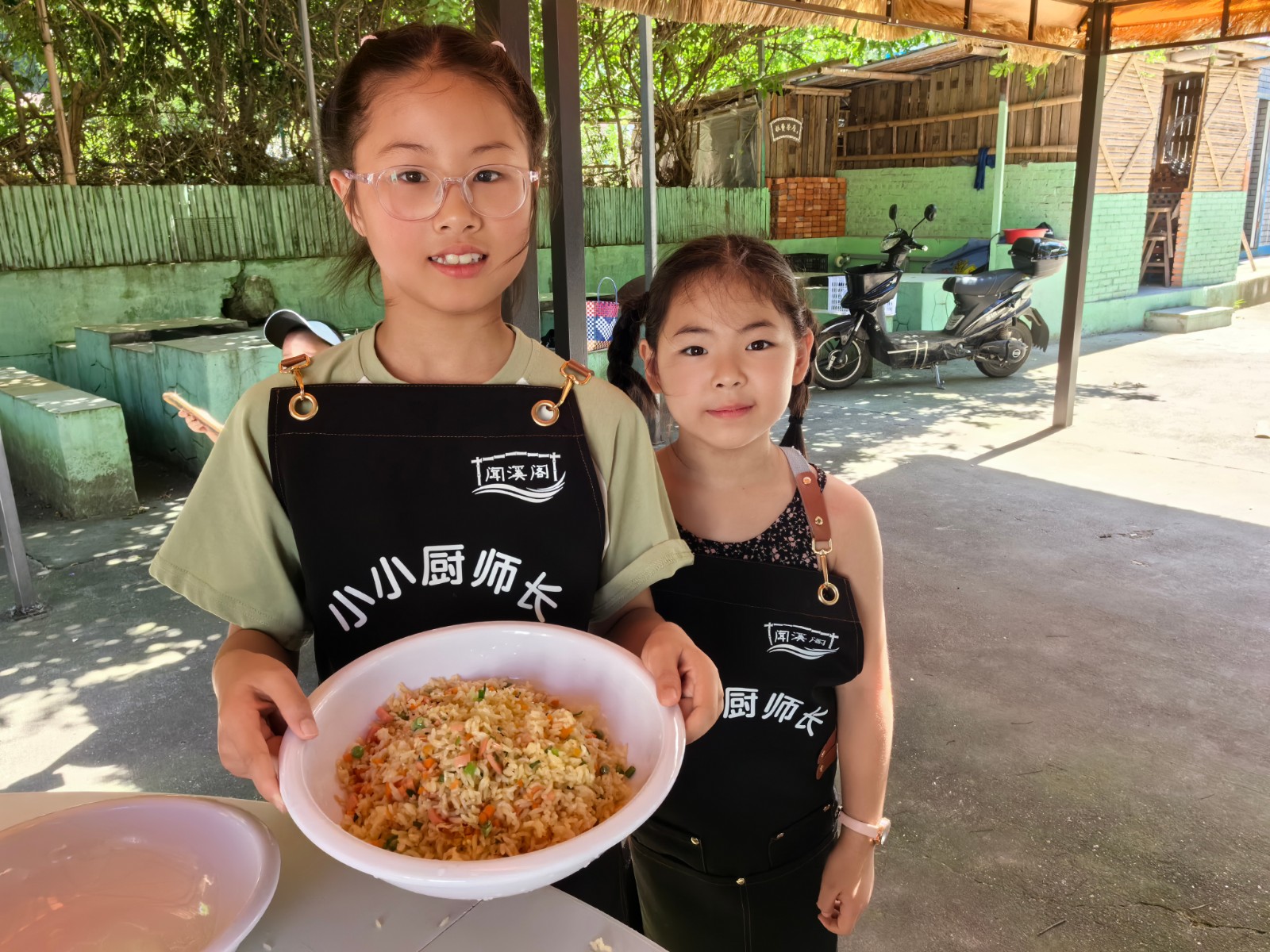 九龙湖闻溪阁热闹非凡。一个个小厨师在土灶前忙得大汗淋漓。原来这里正在举办“烹”然心动,“食”刻相伴小小厨师长职业体验活动。本次活动由九龙湖村关工委联合村妇联共同举办,共有10组亲子家庭参与。老板翁周明先给小朋友们讲解了中国八大菜系、宁波菜的特点,重点介绍了横溪九大碗特色菜。随后发布了今日的做菜任务—扬州炒饭。小厨师们在了解了注意事项后就迫不及待各自组队奔赴岗位。生火、打蛋液、准备小料,个个忙得不亦乐乎。随着一声声“呲啦”的声音,食材纷纷下锅。小厨师们用铲子不断翻炒,直至饭粒颗颗金黄,一份色香味俱全的扬州炒饭就出锅了。此次活动不仅提高了小朋友们的动手能力,而且让他们深入了解和体验了厨师的工作环境和性质,从小培养吃苦耐劳的品质,树立正确的职业观,为他们今后的成长发展助力。