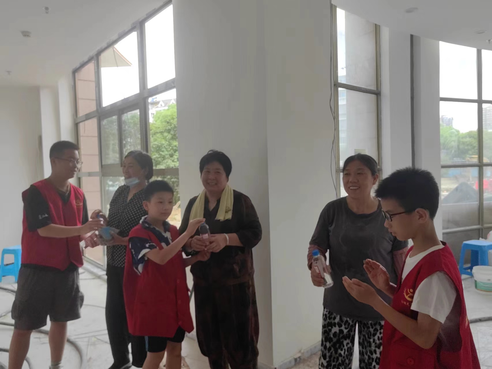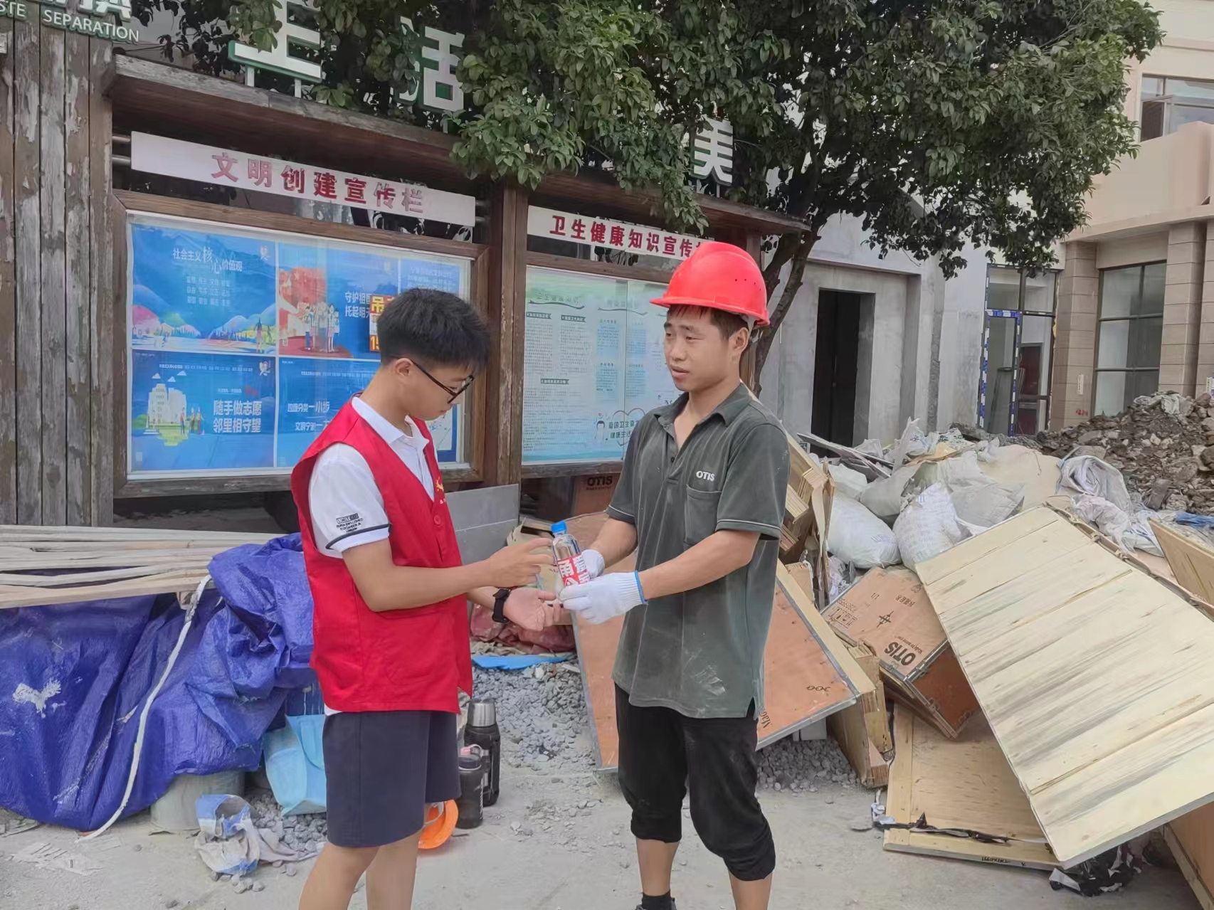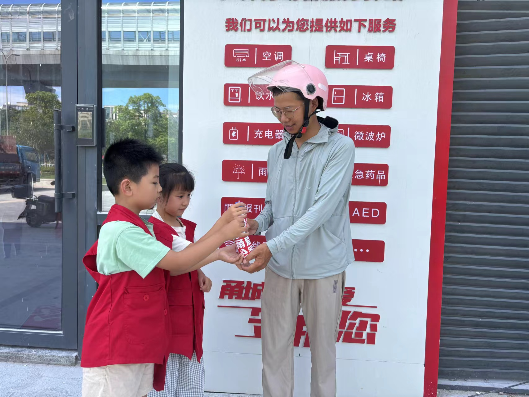 在社区网格员的带领下,临江社区关工委组织小志愿者们,来到临江未来社区建设工地,向为我们打造未来家园的建设者们亲手送上定制清凉饮用水,小志愿者们用稚嫩的声音一一表达感谢和关心,极大地鼓舞了建设者们的工作热情。此外,小志愿者们还自发分组寻找,纷纷向快递员、外卖小哥、保洁员、物业管理人员等群体递送“夏日清凉”,让新就业群体和户外劳动者们真实感受社区家园爱。