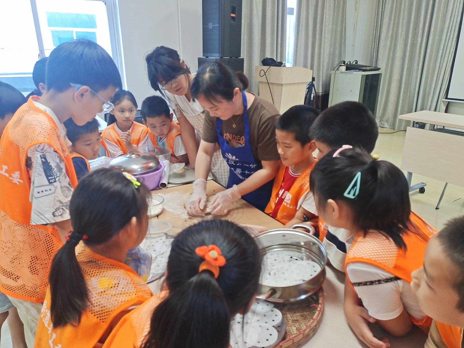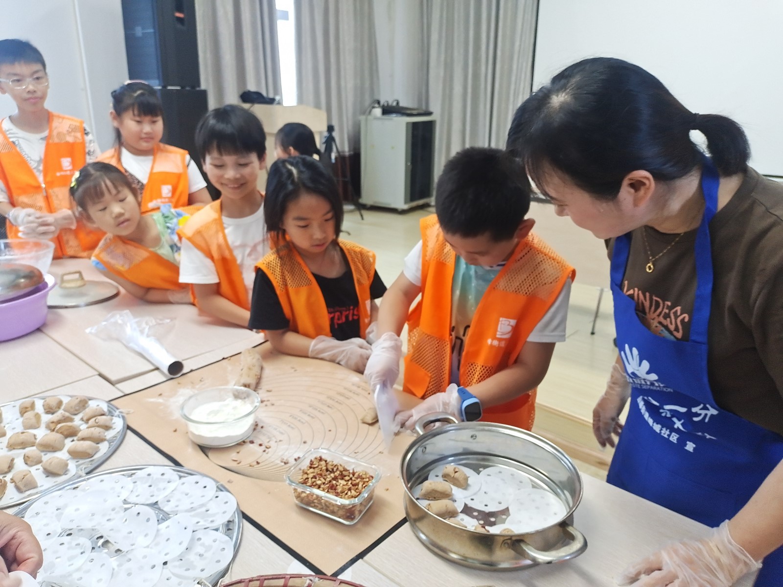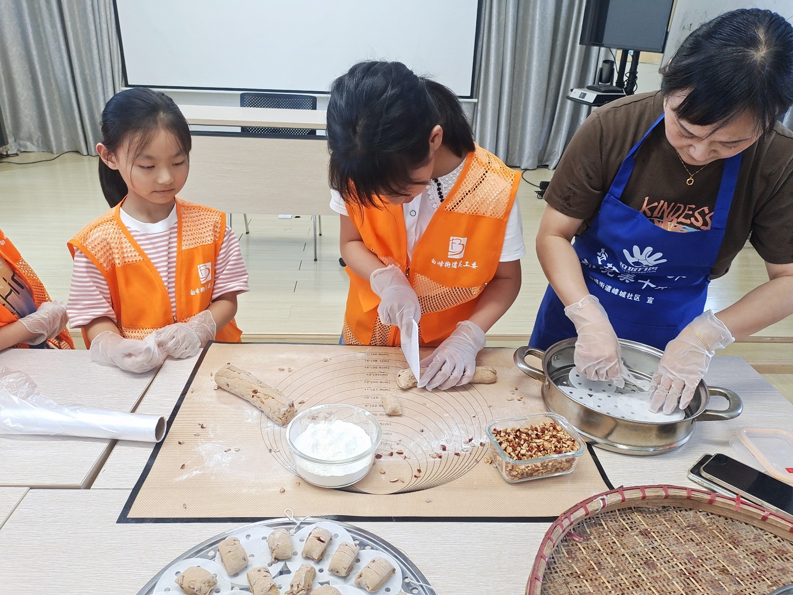 活动现场,志愿者老师为小朋友们提前准备了面粉、酵母粉、红糖、红枣、擀面杖等制作面点的材料工具,同时讲解制作红糖馒头的步骤,包括和面、发酵、坯到醒发等。小朋友们现学现做,有的和面,有的搓面,有的切块,大家都拿出了看家本领,切磋手艺、互相学习,现场欢声笑语不断。