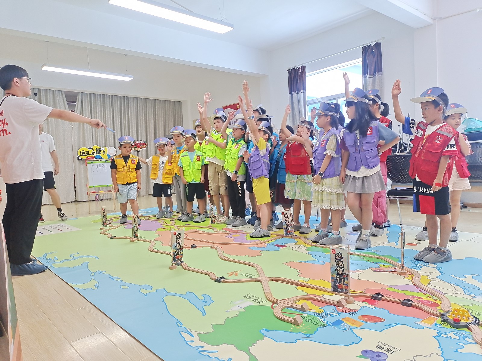 活动中,老师挑选出5名小小列车长,头戴一顶DIY手作的列车长帽子,带着各自的队员们开启一段奇妙的旅行。在3.5米×7米的巨型地图上,有的在翻找轨道积木、有的在传递轨道积木、还有的在搭建轨道积木……小朋友们在各自的岗位上尽职尽责,互相配合、齐心协力,拼搭起一条中欧班列轨道。“哇,我们成功啦!”当小火车顺畅地在地图上运行起来,将货物运到目的地时,小朋友们都开心地欢呼起来。