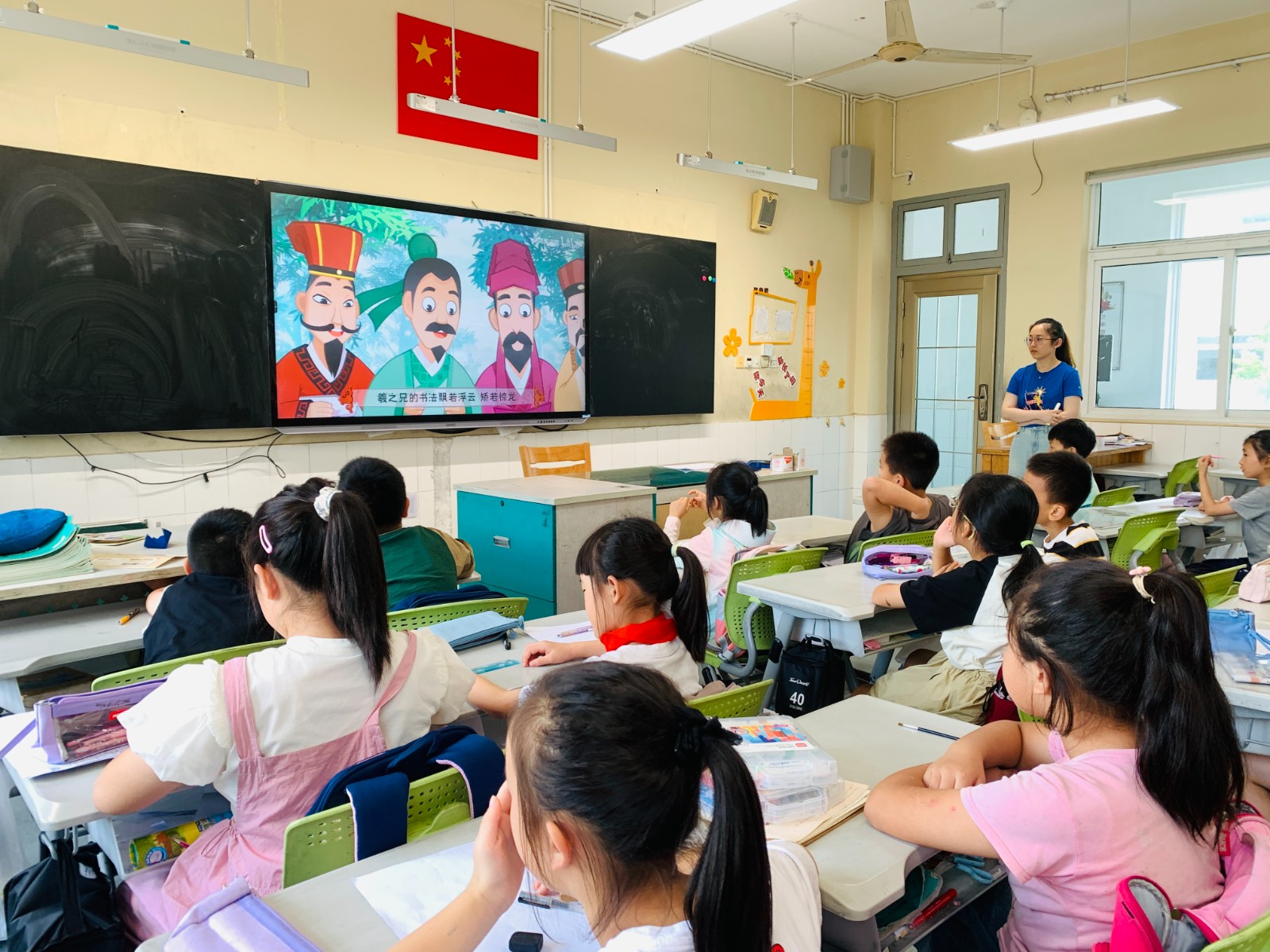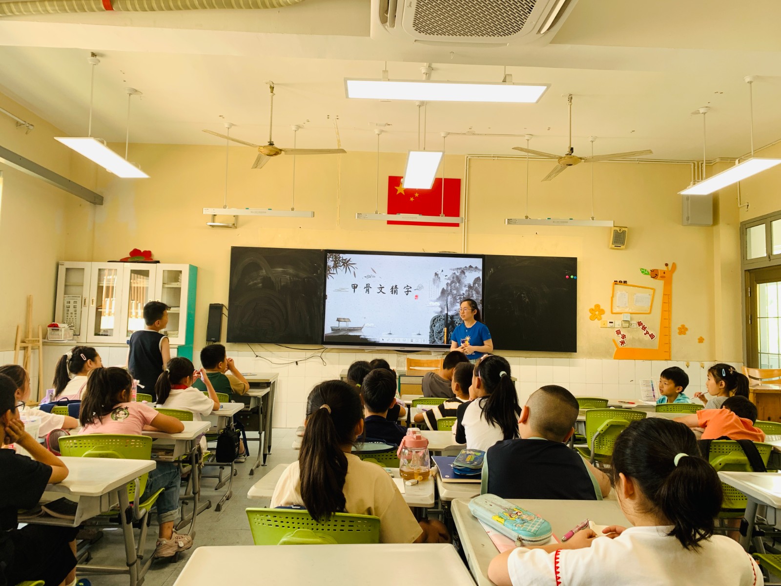 张老师以软笔书法中的偏旁部首作为切入点,通过生动有趣的讲解,让孩子们初步掌握了书法的基本构造。随后,他巧妙地引入甲骨文猜字环节,激发了孩子们的好奇心,使他们在游戏中学习,既轻松又高效。为了让课程更加生动,张昊老师还播放了一段文房四宝(笔、墨、纸、砚)卡通人物的动漫视频。视频中的文房四宝和古代书法家形象栩栩如生,孩子们仿佛穿越时空,与古人对话,对书法艺术产生了浓厚的兴趣。